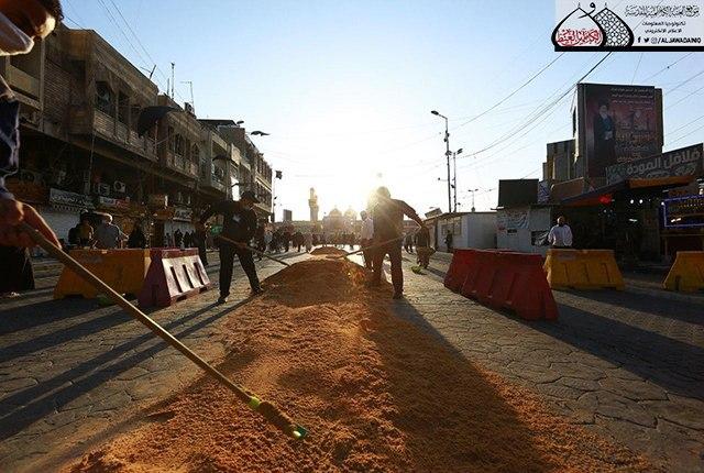 كما تم فرش مادة الرمل في شارع باب المراد التي ستوقد عليها شموع الحزن بهذا المصاب الجلل الذي حلّ بالركب الحسيني وسبي عيالات آل بيت النبوة "عليهم السلام" .