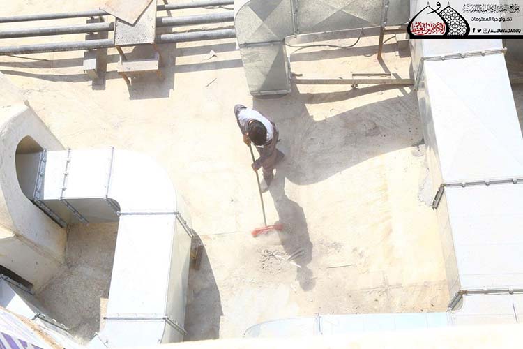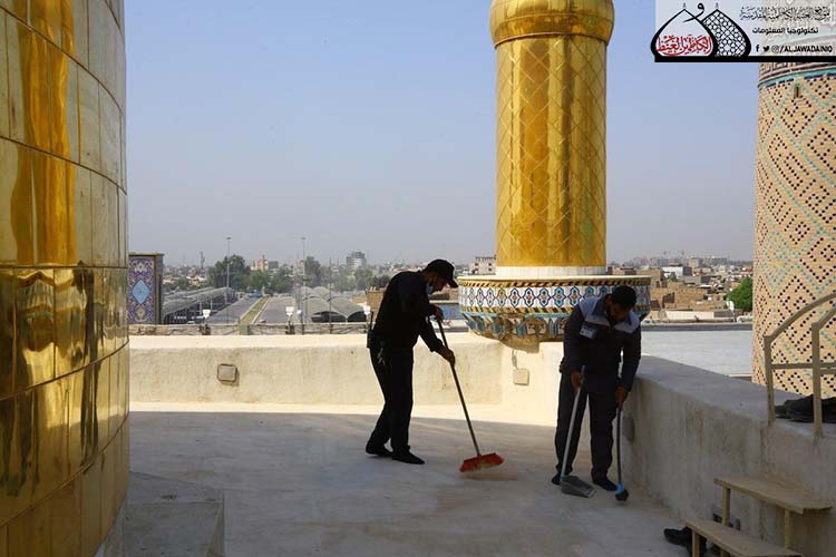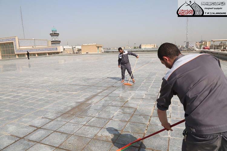 خدّام الإمامين الكاظمين الجوادين "عليهما السلام" يقومون بأعمال تنظيف وإدامة أسطح الحرم الشريف