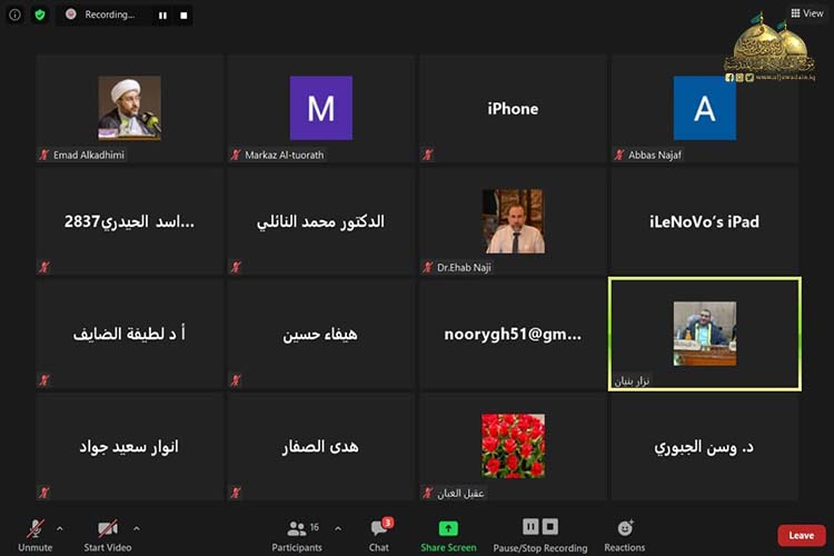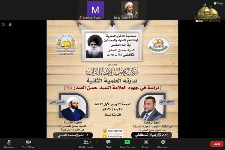 أقامت الأمانة العامة للعتبة الكاظمية المقدسة / مركز الكاظمية لإحياء التراث ندوته العلمية الثانية الافتراضية بعنوان: (دراسة في جهود العلامة السيد حسن الصدر "قدس سره" ) لمناسبة الذكرى السنوية لوفاة فخر الفقهاء والمحدثين آية الله العظمى السيد حسن الصدر "طيب الله ثراه" المتوفى سنة 1254 هـ، وذلك عبر منصة (class room) تطبيقاً لإجراءات الوقاية الصحية، والتزاماً بتوجيهات المرجعية الدينية العُليا، والتعليمات الصادرة من اللجنة العُليا للصحة والسلامة الوطنية لمنع تفشي وباء كورونا.