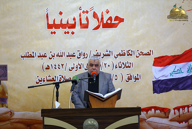 استهل المجلس التأبيني بتلاوة مباركة شنّف بها أسماع الحاضرين قارئ العتبة المقدسة السيد عبد الكريم قاسم وقراءة سورة الفاتحة المباركة ترحماً على أرواح الشهداء الأبرار، بعدها كلمة الأمانة العامة للعتبة الكاظمية المقدسة ألقاها أمينها العام الأستاذ الدكتور حيدر حسن الشمري جاء فيها قائلاً: (عامٌ مرّ على فقدنا قرة عيوننا الأحبة الشهداء من قادة وأبطال معارك الانتصار والتحرير، بعد أن تحققت أغلى أمنياتهم ونيلهم أروع وسام، وسام الشهادة الرفيع ليكونوا بحق من سادة الشهداء المقاومين للظلم والعدوان الداعشي التكفيري، حيث ضربوا برفقة المجاهدين من مُلبي فتوى الدفاع الكفائي أروع الأمثلة في مقاومتهم لقوى الشر والظلام ووقفوا ببسالة وشجاعة بوجه الإرهاب الداعشي التكفيري، كي يهنأ العراقيون ومن بجوارهم في المنطقة بل العالم أجمع بالأمن والأمان، نقف اليوم لنجدد التعازي ولنرفع أسمى آيات الحزن الأسى الممزوجة بدموع الانصار لدين الله الى مقام صاحب العصر والزمان الامام الحجة بن الحسن المهدي " أرواحنا لتراب مقدمهِ الفداء" وإلى مقام المرجعية الدينية العُليا متمثلة بآية الله العظمى سماحة السيد علي الحسيني السيستاني "دام ظله الشريف" وإلى عوائل الشهداء الكريمة الشريفة المجاهدة وأولادهم الكرام، بهذه الفاجعة الأليمة وهي فقد هؤلاء القادة أبطال معارك الانتصار والتحرير المقاومين والمجاهدين.. تصاحبها غبطة منا لهم لنيلهم هذا الشرف الرفيع فقد قال رسولُ الله "صلى الله عليه وآله وسلم": (فوقَ كلِ برٍ برٌ حتى يُقتل الرجل في سبيل الله عز وجل فإذا قُتل في سبيل الله فليس فوقه بِر).