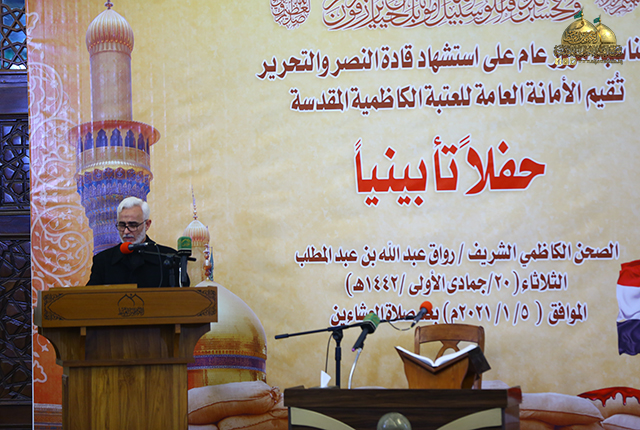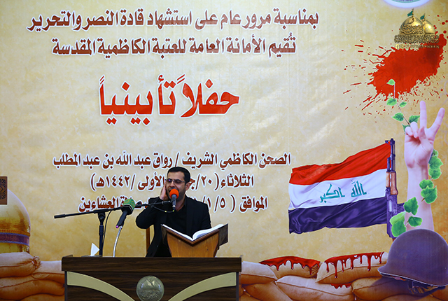 أقامت الأمانة العامة للعتبة الكاظمية المقدسة حفلاً تأبينياً لمناسبة الذكرى السنوية الأولى لاستشهاد القادة الشهداء الأفذاذ الذين نالوا شرف الشهادة جراء العدوان الأمريكي قرب مطار بغداد الدولي، المُلبين لفتوى الدفاع الكفائي التاريخية منذ انطلاقها في الرابع عشر من شعبان المبارك لعام 1435 هـ الموافق الثالث عشر من حزيران 2014م، بعد ما داهم هذا البلد خطر عصابات الإرهاب التكفيري، وبات يهدّد أمن العراق وشعبه ومقدساته، حيث سطّروا خلال مسيرتهم الجهادية أروع صور التضحية والفداء، وكانوا أنموذجاً حقيقياً للروح الوطنية والإيمان العقائدي في تلك المعارك الضروس إذ تركوا فيها بصمة واضحة سيشهد لها تاريخ العراق الحديث.