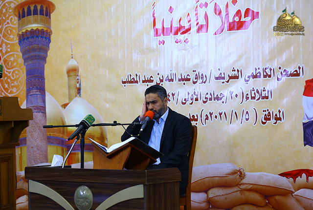 بعدها تعطّرت أجواء الصحن الكاظمي الشريف بالذكر الحكيم والنفحات الإيمانية والقدسية بمشاركة القارئ محمد الربيعاوي، وقارئ العتبة المقدسة الحاج همام عدنان، وكانت هناك مشاركة لخادم العتبة المقدسة الرادود كرار الكاظمي بقراءة مجموعة من المراثي العزائية.