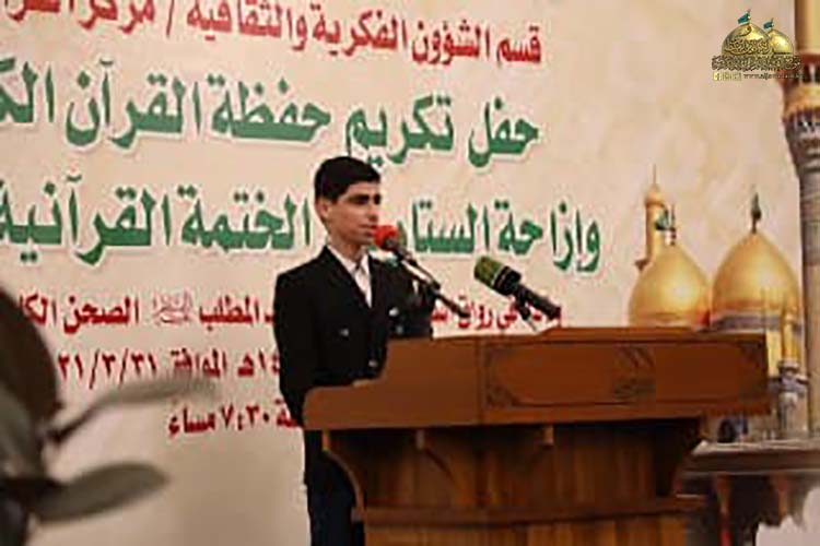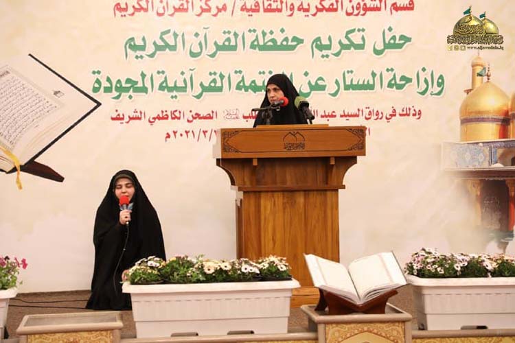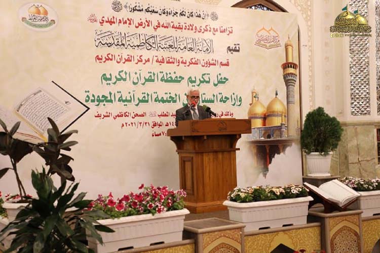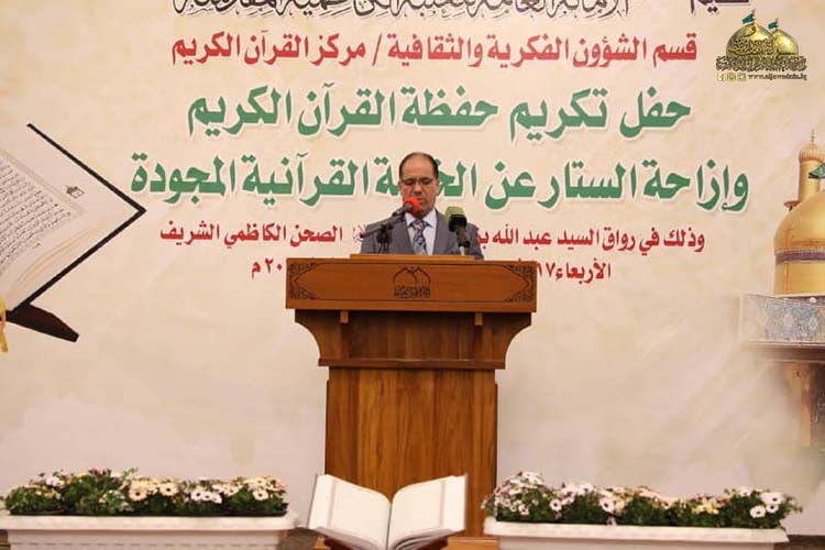 ولا يفوتنا أن نُعلن عن صدور أول ختمة قرآنية مجودة في جمهورية العراق وبهذه المناسبة نبارك بجهود القارئ الدكتور رافع العامري قارئ العتبة الكاظمية المقدسة ومدير المركز الوطني لعلوم القرآن في ديوان الوقف الشيعي لمثابرته في إتمام الختمة المباركة وأنجاز متطلباتها والتي سيُزاح الستار عنها في حفلنا هذا كما أشير إلى إنجاز ختمة قرآنية مرتلة لقارئ العتبة الحاج همام عدنان والتي سجلت بالتعاون مع شعبة الاعلام في العتبة في استوديوهات اذاعة الجوادين مع تصميم واجهات كل صفحة لعرضها على شاشة القنوات.