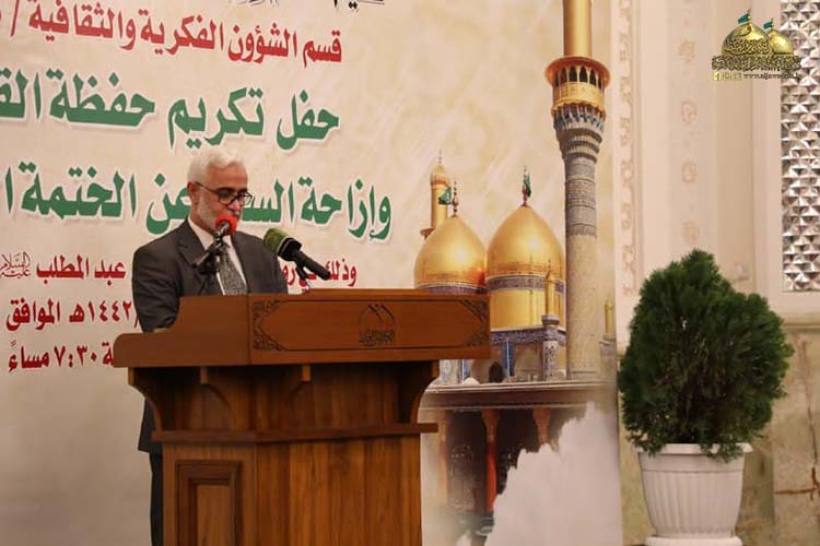 وأضاف: عن الإمام الصادق (عليه السلام) أنه قال: (يَنْبِغِيْ لِلْمُؤْمِنِ أَنْ لَاْ يَمُوْتَ حَتَّى يَتَعَلَّمَ الْقُرْآنَ، أَوْ أَنْ يَكُوْنَ فِيْ تَعَلُّمِهِ).. وغيرها الكثير من الأحاديث الشريفة.. وهذا يلقي علينا مسؤولية الالتزام بما نحفظ ونقرأ ونتعلّم، كي ينطبق قولنا مع سلوكنا.. ومن هذا المنطلق تسعى الأمانة العامة للعتبة الكاظمية المقدسة إلى الاهتمام بكتاب الله العزيز حفظا وتلاوة وتعليما، فها نحن اليوم نجتمع على مأدبة الله في هذا اليوم المبارك للاحتفاء بحملة القرآن الذين دأبوا وسعوا لحفظه بما يعود عليهم بالنفع في الدنيا والآخرة، وقد جدوا واجتهدوا ليقطفوا ثمار جهودهم، وليكونوا مصداقا لقول النبي محمد (صلى الله عليه وآله وسلم): (مَا ٱجتَمَعَ قَومٌ فِي بَيتٍ مِن بُيُوتِ الله يَتْلُونَ كِتَابَ الله، وَيَتَدَارَسُونَهُ بَيْنَهُمْ، إِلَّا نَزَلَتْ عَلَيْهِمُ السَّكِينَةُ، وَغَشِيَتْهُمُ الرَّحْمَةُ، وَحَفَّتْهُمُ الْمَلَائِكَةُ، وَذَكَرَهُمُ اللهُ فِيمَنْ عِندَهُ).