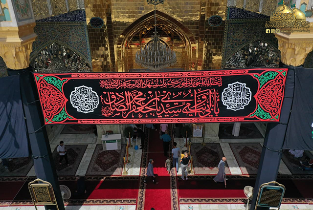 اتَّشحت العتبة الكاظمية المقدسة بمظاهر الحزن والأسى إيذاناً لاستقبال الذكرى الأليمة لاشهادة المؤتمن على الشرع المُبين والمدافع عن عقيدة سيد المرسلين "صلّى الله عليه وآله" الإمام جعفر بن محمد الصادق"عليه السلام"، حيث تم نشر السواد والكلمات النورانية على أعمدة الطارمات والأواوين للحرم المطهر.