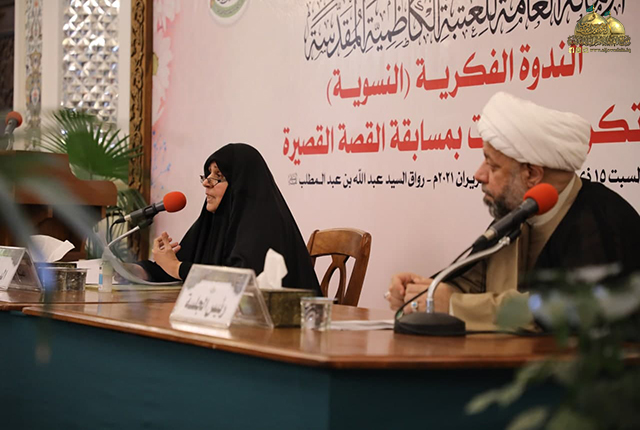 وأضاف: كانت هناك كثير من المحطات لهذه المجلة المباركة منها إقامة الندوات والمسابقات الخاصة بالنساء، وأخيراً كانت مسابقة كتابة القصة القصيرة، حيث وصل عدد المتسابقات إلى (90) مشاركة من داخل العراق وخارجه، وهذا يدل على أن الكلمة الصادقة حينما تصدر من قلوب طاهرة تصل إلى أبعد مسار كما ورد في الحكمة: ما يخرج من القلب يدخل إلى القلب، وبهذه المناسبة أعلن من هذا المنبر الشريف عن وجود دورة تطويرية وورشة عمل في مجال كتابة القصة القصيرة عِبر وسائل التواصل الاجتماعي نسعى من خلالها إلى تدريب الأقلام المتبدئة والواعدة وتنمية مهاراتها ). بعدها شهدت الندوة استعراض تقرير تلفزيوني أعدته شعبة الإعلام/ وحدة قناة الجوادين حول مسيرة زهور الجوادين ومشوار مسابقة القصة القصيرة، لتبدأ بعد ذلك جلسة الندوة العلمية لمناقشة عدد من الأوراق البحثية، فكان البحث الأول بعنوان: (الإعلام النسوي في العراق ومتغير التحديات) للباحثة د. بيان عبد الحسين العريض، وكان البحث الثاني بعنوان: (تجربة الإعلام النسوي/ مجلة زهور الجوادين أنموذجاً) للباحثة منتهى محسن.