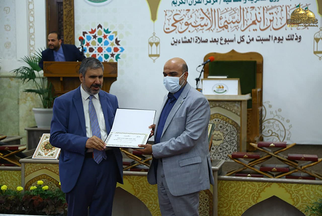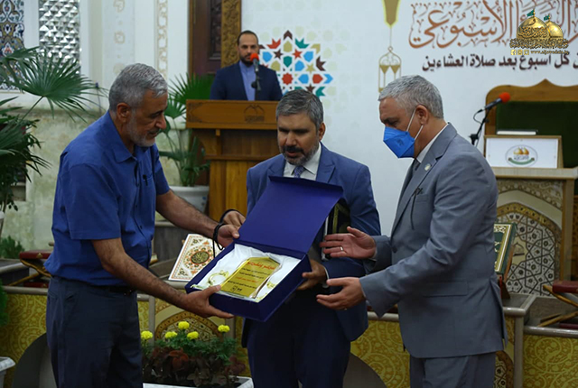 واختتم المحفل بتقديم الشهادات التقديرية والهدايا إلى رئيس مؤسسة الكفيف القرآنية الثقافية الدكتور وسام الخزعلي، والقرّاء المشاركين والفائزين بمسابقة الأسئلة والأجوبة، في الوقت ذاته قدمت المؤسسة درعاً إلى الأمانة العامة للعتبة الكاظمية متمثلة بأمينها العام خادم الإمامين الكاظمين الجوادين الدكتور حيدر الشمّري وأعضاء مجلس إدارته الموقّر وذلك للدور الكبير والفاعل والاهتمام البالغ بذوي البصيرة ورعاية نشاطاتهم القرآنية.