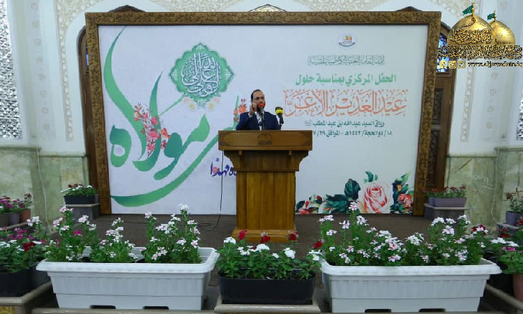 وأضاف: إن الحديث عن يوم الغدير الأغر إنما هو حديثٌ عظيم مُشرق ليوم من أيام التأريخ الإسلامي لما لهُ من علاقة وثيقة بمقام وفضل أمير المؤمنين علي بن أبي طالب "عليه السلام" بصورة عامة والتأكيد على إمامته بالمسلمين بصورة خاصة، وهل هناك مناسبةٌ أعظم من هذه المناسبة التي لها علاقة بالعقيدة الإسلامية والحفاظ على تعاليم الشريعة المقدسة بعد رحيلِ النبي "صلى الله عليه وآله وسلّم" بما لا يخفى على أحد من المسلمين وغيرهم تلك العلاقة الوثيقة التي لا تفترق بين النبوة والإمامة وما كان يبذله النبي "صلى الله عليه وآله وسلّم" من جهودٍ كبيرة طيلة حياته الشريفة في بيان ذلك للمُسلمين كما أمره الله تعالى فكان "صلى الله عليه وآله وسلّم" يؤكد في مناسباتٍ كثيرةٍ ولايتهُ للأمة وبيان فضله ومقامه وعدم مساواة غيره له بذلك وأنه مقياس معرفة الحقّ فهو مع الحقّ والحقّ معه يدور حيثما دار فلا يفترق أحدهما عن الآخر أبداً، ولو رجعنا إلى صفحات التأريخ لرأينا في ذلك موارد ومواقف متعددة فكان الأمر مقترناً ببيان ذلك للناس منذُ الأيامِ الأولى للبعثة النبوية الشريفة والسعي إلى تأسيس الدولة الإسلامية وما يتعلق بها وهذا ما ذكرتهُ المصادر التأريخية والحديثية وخصوصاً الحديث المشهور بحديث "يوم الدار" .. ).