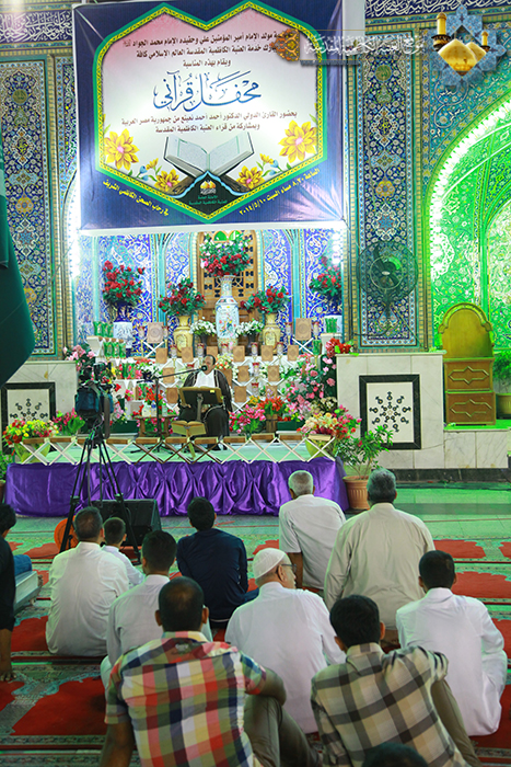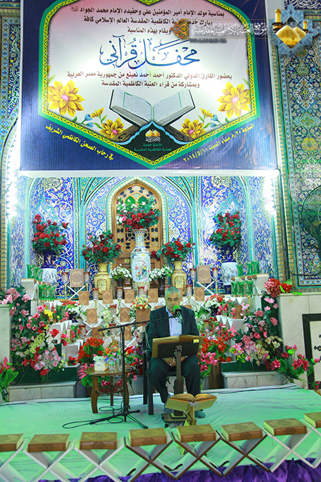 في اجواء ملؤها الفرح والسرور وفي رحاب القداسة والولاء من جوار الإمامين الهمامين الكاظمين "عليهما السلام" وبمناسبة مولد أمير المؤمنين علي المرتضى وحفيده الإمام محمد الجواد "عليهما السلام" أقيم في الصحن الكاظمي الشريف محفل قرآني بحضور القارئ الدولي الكبير الدكتور "أحمد أحمد نعينع" من جمهورية مصر العربية وبمشاركة من قراء العتبة الكاظمية وسط حضور جماهيري من الزائرين الكرام والمهتمين بالشأن القرآني .