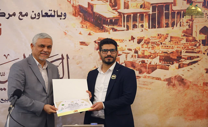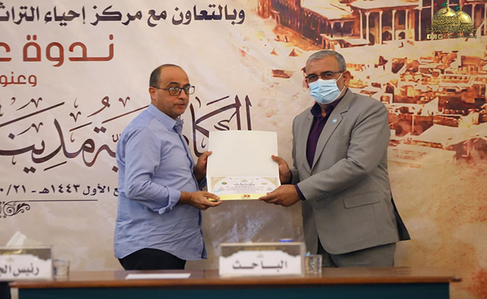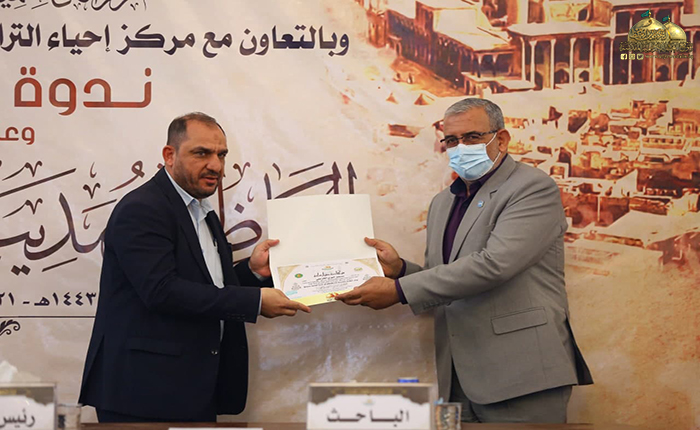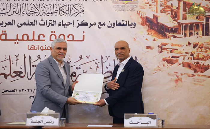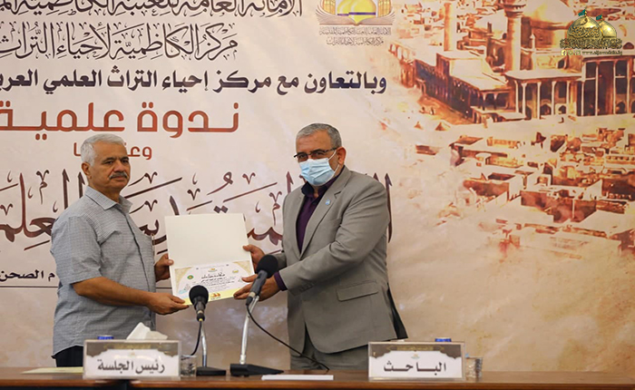 بعدها بدأت الجلسة البحثية حيث استعرضت الأستاذ مساعد دكتور زينب كامل كريم في مركز إحياء التراث العلمي العربي/ جامعة بغداد ورقة بحثية بعنوان: (الأستاذ ناجي محفوظ وجهوده في إحياء التراث)، تلتها ورقة بحثية للباحث والمحقق المهندس عبد الكريم الدباغ بعنوان: ( المدرسة الحيدرية ودورها الفكري والثقافي في مدينة الكاظمية المقدسة)، بعدها قدّم الأستاذ مساعد دكتور أحمد عبد الواحد الحلفي مركز إحياء التراث العلمي العربي/ جامعة بغداد بحثه بعنوان: (الرحالة والمستشرقون ودورهم في إحياء تراث المشهد الكاظمي)، ثم استعرض خادم العتبة المقدسة في مركز إحياء التراث الباحث محمد حسن فيصل ورقة بحثية بعنوان: (قراءة في أرشيف الدكتور حسين علي محفوظ الخاص بمركز الكاظمية لإحياء التراث/ الدراسات التراثية المخطوطة أنموذجاً)، ثم قدّم الأستاذ الدكتور سعدي إبراهيم الدراجي في مركز إحياء التراث العلمي العربي/ جامعة بغداد ورقة بحثية بعنوان: (شاهد قبر معتمد الدولة القاجارية فرهاد ميرزا (ت 1305 هـ) في العتبة الكاظمية المقدسة ـ دراسة أثرية فنية)، وكانت هناك مشاركة لخادم العتبة الكاظمية المقدسة فضيلة الشيخ منير الكاظمي بورقة بحثية بعنوان: (آثار كاظمية في حفظ التراث الإمامي/ تأسيس الشيعة الكرام لعلوم الإسلام والشيعة الناجية أنموذجاً)، بعدها استعرض الدكتور علاء كريم فرحان رئيس بيت المسرح في الاتحاد العام للأدباء والكتاب في العراق ورقة بحثية بعنوان: (تَشَكُّل الهوية في الثقافة الحضارية لمدينة الكاظمية المقدسة)، بعدها قدّم خادم العتبة الكاظمية المقدسة في مركز إحياء التراث الباحث سمير أموري رؤوف ورقة بحثية بعنوان: (الكاظمية في عيون الرحالة والمستشرقين)، أعقبه المساعد الدكتور حسين علي جبر التدريسي في كلية الإمام الكاظم/ ميسان بورقة بحثية بعنوان: (الدكتور جواد علي ودوره في الدفاع عن الفكر الشيعي). وشهدت الندوة العلمية إيجاز فوائدها ومداخلات من قبل السادة الحضور والمشاركين عكست مدى توجههم وتفاعلهم مع موضوعاتها التراثية القيّمة، واختتمت بتوزيع الشهادات التقديرية والهدايا على السادة الباحثين.