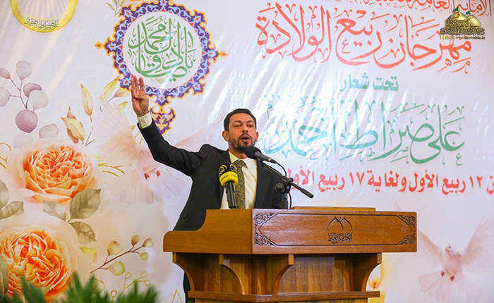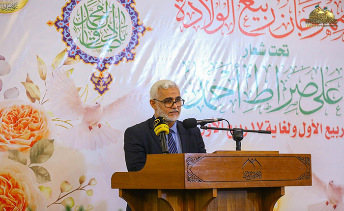 وأضاف: علينا أن نكون امتداداً حقيقياً لهذه الرحمة، من خلال التمسك بالشريعة المقدسة، وجعلها منهجاً راسخاً في واقعنا، لنكون مصداقاً لتلك الأسوة المباركة، ونكون من أتباعه وأنصاره وشيعته العاملين بنهجه الداعين إليه، وعلينا أن نستضيء بأنوار قرآنه الذي أخرج الناس من الظلمات إلى النور، ولنحافظ على نعمة الإسلام التي نحن عليها، ونجعلها زاداً مادياً ومعنوياً في تربية أبنائنا، والحفاظ عليهم من الانحرافات المختلفة، وتحصين شبابنا بروح الإيمان والعقيدة الإسلامية، لنراهم رجال المستقبل الذين يتجلى فيهم حُبّ الدين والوطن، وعلينا أن نعمل بكلّ ما أوتينا من قوة من أجل ترسيخ معالم المحبة والأخّوة والوحدة، كما قال تعالى: (إِنَّمَا الْمُؤْمِنُونَ إِخْوَةٌ فَأَصْلِحُوا بَيْنَ أَخَوَيْكُمْ ۚ وَاتَّقُوا اللَّهَ لَعَلَّكُمْ تُرْحَمُونَ)، وعلينا بالتواصل والتعاون للحفاظ على بلدنا وأبنائنا وخيراتنا كلها، والدفاع عن مقدساتنا الإسلامية، وبذل الجهود من أجل التعريف بها في مناهجنا التعليمية، وندواتنا ومجالسنا ومحافلنا وديمومة المطالبة بالحقوق المشروعة فيها، وخصوصاً القدس الشريف أولى القبلتين وثاني الحرمين، فلا نرضخ لأي دعوة ظاهرة أو باطنة للتنازل أو التنزُّل عن هذه الحقوق المقدسة بأسباب دنيوية واهية.