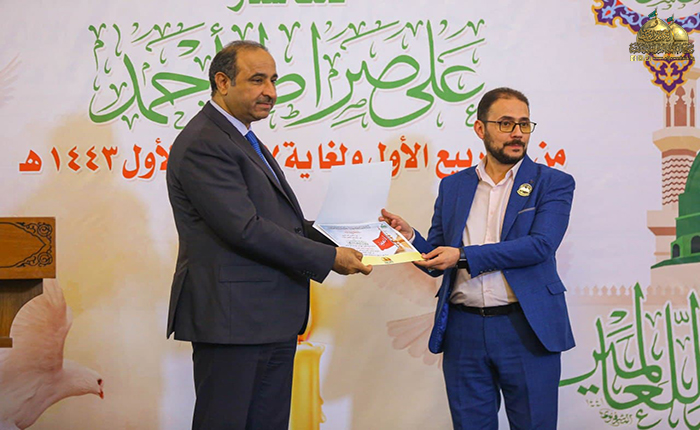 في كل عام ومع بزوغ فجر يوم السابع عشر من شهر ربيع الأول تتوارى الشمس حياءً وخجلاً من سطوع نور النبوة والإمامة وولادة سيد الأنبياء والمرسلين محمد "صلى الله عليه وآله" الذي بعثه الله هداية ورحمة للعالمين لينقذهم من ظلمات الكفر والشرك إلى نور الإيمان والتوحيد، وحفيده عميد الصادقين ولسان الناطقين الإمام جعفر بن محمد "عليه السلام"، واحتفاءً بهذه المناسبتين المباركتين، وغمرة الأفراح التي يعيشها العالم الإسلامي، شهدت العتبة الكاظمية المقدسة، وبرعاية كريمة من معالي رئيس ديوان الوقف الشيعي خادم الإمامين الكاظمين الجوادين الدكتور حيدر حسن الشمّري احتفالاً مركزياً بهيجاً بحضور أعضاء مجلس الإدارة، والأمين العام للعتبة العسكرية المقدسة، ووفود العتبات المقدسة العلوية والحُسينية والعباسية، ووفود المزارات الشريفة، ووفد رئاسة مجلس الوزراء، ورئيس ديوان الوقف السنُي، ووزير الثقافة والسياحة والآثار، وأمين بغداد، وعددٍ من الشخصيات الدينية والحكومية والاجتماعية، وجمع غفير من زائري الإمامين الكاظمين الجوادين "عليهما السلام".