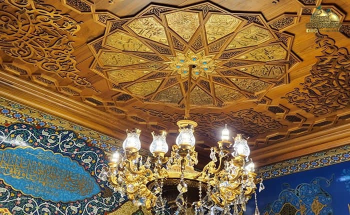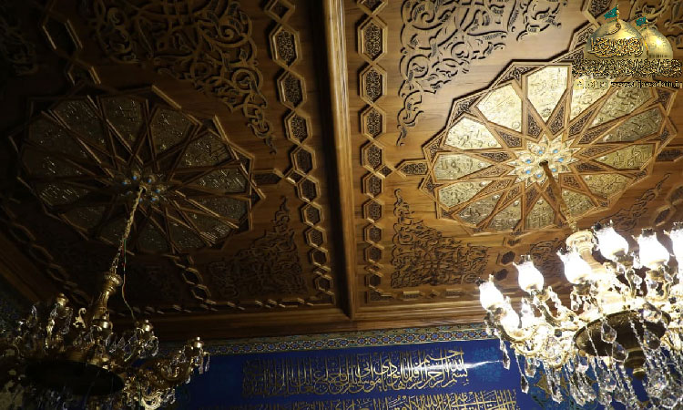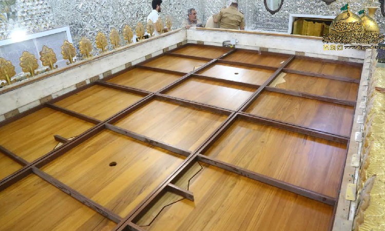 وكانت أولى مراحل العمل إزالة الخشب والنقوش القديمة والقيام بأعمال الصيانة والمعالجة الإنشائية، مع مراعاة الحفاظ على العناصر النفيسة، بعدها تم تنفيذ ونصب سقفين من قبل الملاكات الفنية في وحدة النجارة والألمنيوم باستخدام أجود أنواع الخشب "الساج"، ونقشت على كل منهما نجمة تتكون من أربعة عشرة رأساً تيمناً بالرسول الأكرم والسيدة الزهراء والأئمة الأثنى عشر من ولدها "عليهم السلام"، تتوسطهما سبع أحجار كريمة من حجر "الفيروز" دلالة للإمام السابع موسى بن جعفر الكاظم "عليه السلام".