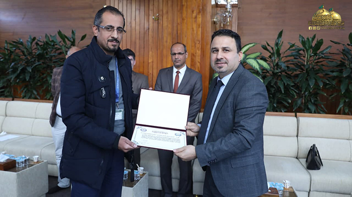 في الوقت ذاته أهدى الوفد الزائر شهادات الشكر والامتنان إلى الأمانة العامة للعتبة الكاظمية المقدسة متمثلة بخادم الإمامين الكاظمين الجوادين الدكتور حيدر حسن الشمّري، وذلك تقديراً لدوره في رعاية المشاريع الإعلامية والمعرفية والثقافية.