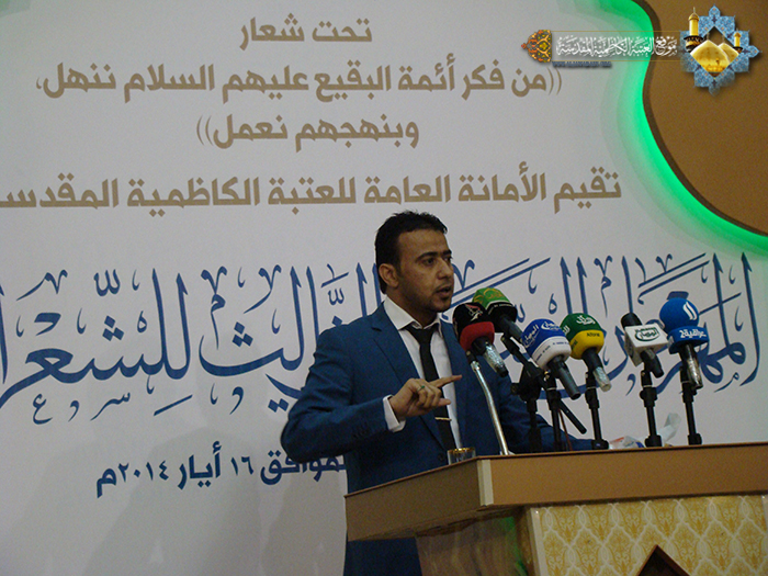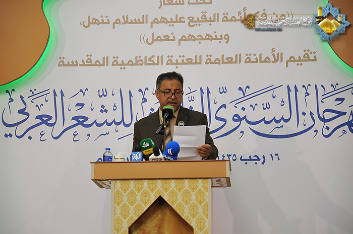وأضاف قائلاً: لقد حرصت الأمانة العامة للعتبة الكاظمية المقدسة على إقامة المهرجان الشعري ورعايته عاماً بعد عام حرصاً منها على خلق فضاءات ومساحات واسعة للإبداع، تحتضن فيها المواهب والقدرات الأدبية لتنتج مزايا وفنوناً شعرية تعبر عن خصوصية لآل البيت "عليهم السلام" ذات مستوى عالٍ من العطاء والإبداع، وكان دور لجنة تقويم النصوص اختيار ما هو أفضل لأجل أن يكون الاختيار مميزا لهذا العام أملاً منها أن يصبح المهرجان السنوي للشعر العربي في العتبة الكاظمية المقدسة مضماراً يتبارى ويتسابق فيه المبدعون من الشعراء، ونؤكد ذلك أن القصائد المختارة للمشاركة لهذا العام هي (27) قصيدة من بين (58) قصيدة وردت للجنة المنظمة.."