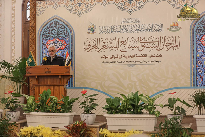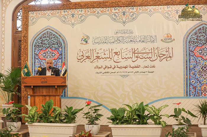 تلتها كلمة اللجنة المنظمة لمهرجان الشعر العربي ألقاها رئيسها المهندس جلال علي محمد بيّن فيها قائلاً: (أن الشعر مستودع الحكمة والفصاحة وديوان حافل بالأحداث والعبر والمودة. وتؤكّد صوَرُه عمق الولاء وشدّة الارتباط بالقادة الرساليين. ولترسيخ هذه المفاهيم وتوظيف فن الشعر لبيان واقع الوجد والفقد والغياب ومدى العلاقة بين المسلم وإمام زمانه أقامت الأمانة العامة للعتبة الكاظمية المقدسة المهرجان السنوي السابع للشعر العربي حيث تسلمت اللجنة المنظمة للمهرجان أربعا وعشرين قصيدة من داخل العراق وخارجه تسابقت قوافيها في مضمار الشوق والحنين للطلعة البهية للإمام المهدي عجل الله تعالى فرجه الشريف واستعرضت موضوع الانتظار وتعجيل الفرج بمفردات تحاكي مرايا الروح وتعكس ذاته المتألمة بين عنوانات الظلم والجور. فتم قبول اثنتين وعشرين قصيدة بعد عرض جميع المشاركات على لجنة ذات خبرة للفحص والتقويم وها نحن اليوم وإياكم في هذه الرحاب الطاهرة نموج معا في بحور القوافي ونحلق سويا في فضاءات الولاء. تحت شعار "القضية المهدوية في قوافي الولاء").