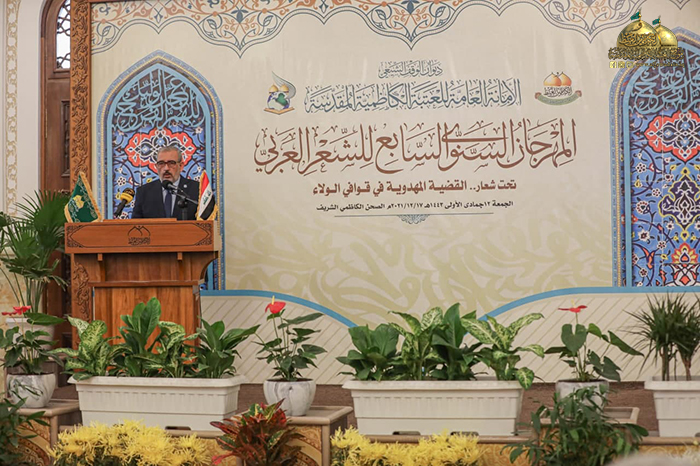 مع عذوبة الألفاظ، وجمال الصور الشعرية، ورسم اللوحات الوجدانية، وبلاغة المفردات، ودعم الأمانة العامة للعتبة الكاظمية المقدسة المتواصل للمشروع الثقافي ورعاية الحركة الأدبية والفكرية وإيمانها بضرورة الاهتمام بالإبداع والمبدعين والأدباء والشعراء والمثقفين، وشوقها الشديد للعودة بالشعر العربي الفصيح إلى مشاربه الأولى وجذوره الأصيلة ونشر الكلمات الصادقة في لغة الضاد، كان لنا موعد جديد مع ميادين الثقافة والشعر والأدب في رحاب الصحن الكاظمي الشريف وانطلاق فعاليات المهرجان السنوي السابع للشعر العربي يوم الجمعة 17 كانون الأول 2021 هذا المُلتقى الأدبي السنوي الذي درجت على تنظيمه الأمانة العامة للعتبة الكاظمية المقدسة والذي انعقد تحت شعار: (القضية المهدوية في قوافي الولاء)، بحضور خادم الإمامين الكاظمين الجوادين، الأمين العام للعتبة الكاظمية المقدسة الدكتور حيدر حسن الشمّري، وأعضاء مجلس إدارته الموقّر، وممثل المرجعية الدينية العُليا في مدينة الكاظمية المقدسة سماحة الشيخ حُسين آل ياسين، وكوكبة من الشخصيات الأدبية والثقافية والأكاديمية والكتّاب والمثقفين المتذوقين للشعر العربي الفصيح، وبمشاركة نخبة من الشعراء والأدباء الذين جاءوا من مختلف محافظات عراقنا الحبيب ومن خارجه، ليقدموا ما جادت به قريحتهم من نظم وقصائد غرّاء.