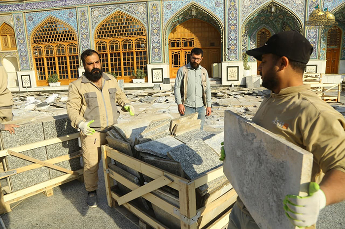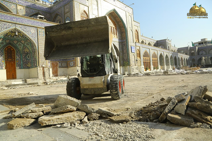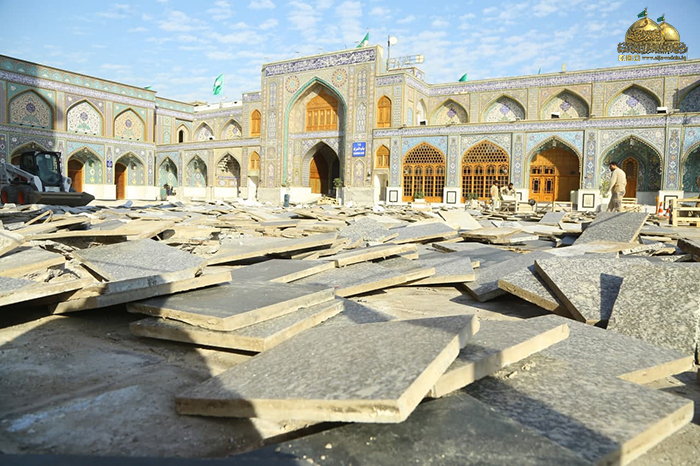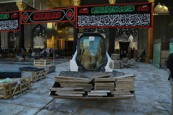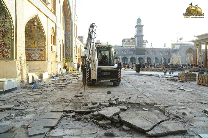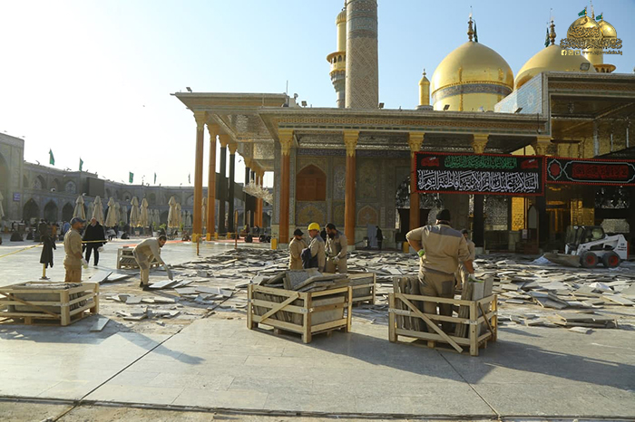 وشهدت أولى خطوات المشروع الموافقة على التصاميم النهائية، وتقديم دراسة وافية لموقع التنفيذ، وإزالة طبقة الإكساء القديم ورفع المرمر لتبدأ بعدها مرحلة المعالجات وحفر المسارات والأنفاق الجديدة على محيط الصحن القديم والطارمات، والتي تتضمن منظومة تجهيز الطاقة الكهربائية، ومنظومة الإنارة، ومنظومة التبريد المركزي، ومنظومة مياه الشرب (RO)، ومنظومة مياة الأمطار، ومنظومة إطفاء الحريق، ومنظومة الاتصالات، ومنظومة الكاميرات والصوتيات، وستكون المرحلة اللاحقة إكساء أرضية الصحن الشريف وقواعد القامات والأواوين بالمرمر (الثاسيوس)عالي الجودة وهو ذات المرمر الموجود في الحرم المكي والحرم المدني بإذنه تعالى، وأن هذا المرمر سيتم التبرع به من قبل الموالين المؤمنين أتباع النبي وآله الأطهار "عليهم السلام" عن طريق "الاتحاد العالمي للمسلمين الخوجه" خدمة للزائرين الكرام.