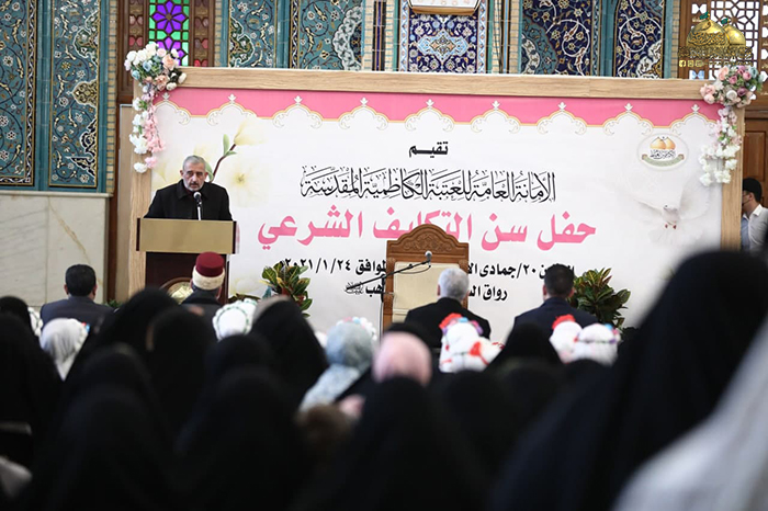 دأبت الأمانة العامة للعتبة الكاظمية المقدسة متمثلة بأمينها العام خادم الإمامين الكاظمين الجوادين "عليهما السلام" الدكتور حيدر حسن الشمّري على رعاية الفعاليات التربوية التي من شأنها ترسيخ الثقافة الدينية في نفوس أجيالنا الفتية، وبيان الفوائد التربوية والمعنوية المتوخاة من الالتزام بالوظائف والتكاليف الشرعية، وعلى هذا السبيل أقامت الأمانة العامة للعتبة الكاظمية المقدسة/ قسم الشؤون الفكرية والثقافية/ مركز القرآن الكريم ـ وحدة الإرشاد والشؤون القرآنية النسوية حفل تكليف لـ (300) فتاة ممن أتمَمَن التسع سنوات قمرية من أعمارهن، تزامناً مع ذكرى ولادة سيدة نساء العالمين فاطمة الزهراء "عليها السلام" بحضور نائب الأمين العام للعتبة الكاظمية المقدسة المهندس سعد محمد حسن، وذوي الفتيات المكلفات.