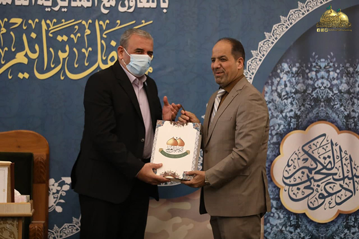وسط غمرة الأفراح التي تعيشها أمتنا الإسلامية بحلول ذكرى ولادتي أمير المؤمنين وقائد الغر الميامين الإمام علي بن أبي طالب، وحفيده شباب الأئمة الإمام محمد بن علي الجواد "عليهم السلام"، أقامت الأمانة العامة للعتبة الكاظمية المقدسة/ قسم الشؤون الفكرية والثقافية/ مركز القرآن الكريم بالتعاون مع المديرية العامة للتوجيه العقائدي في الحشد الشعبي محفلاً خاصاً في رواق سيدنا عبد الله بن عبد المطلب "عليه السلام"، ضمن فعاليات محفل ترانيم السماء القرآني الأسبوعي بحضور عضو مجلس الإدارة المهندس جلال علي محمد، وسماحة السيد محمد الحيدري "دامت توفيقاته" مدير التوجيه العقائدي في الحشد الشعبي، وكوكبة من الأساتذة والمختصين بالشأن القرآني، وجمع غفير من زائري الإمامين الكاظمين الجوادين "عليهما السلام".
