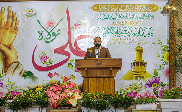 وأضاف: أن واقعة الغدير واقعة غضة طرية مهما تعاقبت عليها الأحقاب والأعوام وكأنها واقعة بالأمس، لا تبليها الحوادث أو تحرّفها الحكومات مهما حاولت ومهما سخرّت من جهود وطاقات في إخفاء حقيقتها، لأنها محل العناية السامية والرعاية المتواصلة من الله بما حفها من آيات بينات تتلى آناء الليل وأطراف النهار، وبما أولاها رسول الله "صلى الله عليه وآله وسلم" من عنايته واهتمامه، وبما سخر الله لها من ألسن الشعراء والمنشدين كي يلفت سبحانه وتعالى نظر الناس إلى ما يدينون به لله في باب خلافته الكبرى، وكي يُبقي حقيقة الغدير بوجهها الجميل حقيقة ناصعة ثابتة بعيدة عن التغيير والنسيان وسيقى شذاها قائما يجوب أجواء السنين حتى يأذن الله تعالى بظهور ولده الحجة بن الحسن عجل الله تعالى فرجه الشريف ليملأ الأرض قسطا وعدلا بعدما ملئت ظلما وجورا). وكان للشعر نصيب في الحفل المبارك حيث ألقى الشاعر الأديب السيد نبيل أبو العيس الكاظمي قصيدة ولائية رائعة بعنوان (غديرية الإمام علي) ومن أبياتها: