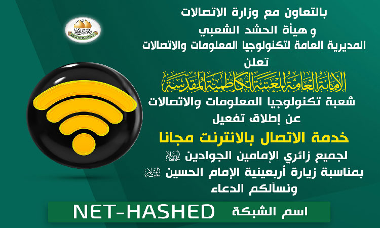 وسط توافد جموع الزائرين الكرام من داخل العراق وخارجه من مختلف الجنسيات والأطياف والأعراق لزيارة الإمامين الكاظمين الجوادين "عليهما السلام" وإحياء موسم أربعينية سيد شباب أهل الجنة الإمام الحسين "عليه السلام"، وفي خطوة جديدة لنجاح الزيارة المباركة، وبتوجيه من قبل الأمين العامة للعتبة الكاظمية المقدسة خادم الإمامين الكاظمين الجوادين الدكتور حيدر حسن الشمري، وبإشراف نائب الأمين العام المهندس سعد محمد حسن أطلقت هيأة الحشد الشعبي وبالتعاون مع الشركة العامة للاتصالات والمعلوماتية وبإسناد شعبة تكنولوجيا المعلومات والاتصالات في العتبة المقدسة مبادرة خدمة الاتصال بالإنترنت "المجاني" للزائرين الكرام وتأمين هذه الخدمة في الشوارع المحيطة بالصحن الكاظمي الشريف.