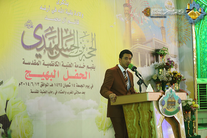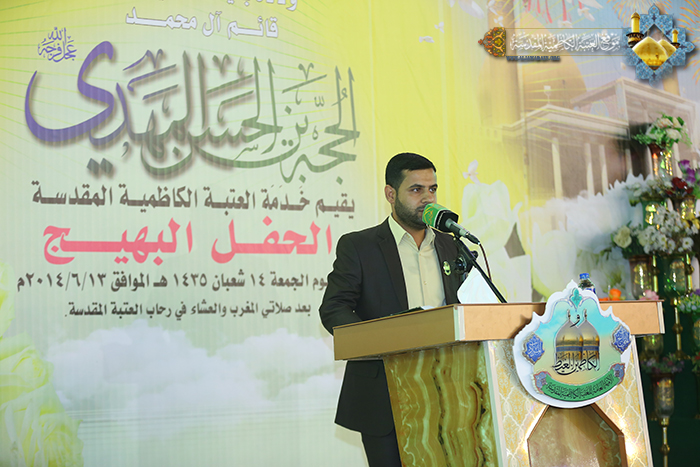 كما بين في قوله: نحن اليوم بحاجة للرجوع إلى المهدي المنتظر من خلال علمائنا ومراجعنا لأنهم صمام أمان غيبة صاحب العصر والزمان، وها هي المرجعية الرشيدة اليوم أعلنت دعمها ومساندتها لأبناء القوات المسلحة الباسلة أولئك الذين شمروا بسواعدهم لحماية البلد من دنس الظلم والظالمين ووجهت بضرورة رص الصفوف ودعم المؤسسة العسكرية من خلال حث الشباب في الانخراط في صفوفها ليدافعوا عن بلدهم ومقدساتهم أمام أشرس قوة ظلامية يتعرض إليها العراق من قوى الكفر والكافرين. وكان للشاعر الأستاذ "رياض عبد الغني الكاظمي" قصيدة رائعة من الشعر القريض بعنوان " اغثنا يا حجة الله "جادت بها قريحته بمولد الموعود بالنصر المبين والذخور لنصرة الدين ومنها هذه الأبيات :