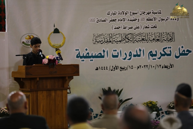 تيمناً بذكرى ولادة خاتم الأنبياء والمرسلين النبي محمد "صلّى الله عليه وآله وسلم"، وحفيده الإمام جعفر الصادق "صلوات الله عليهم أجمعين"، وضمن برنامج مهرجان ربيع الولادة الرابع المُقام تحت شعار: (على صراط أحمد)، وبرعاية مباركة من قبل السيد الأمين العام للعتبة الكاظمية المقدسة خادم الإمامين الكاظمين الجوادين الدكتور حيدر حسن الشمّري، أقام مركز القرآن الكريم التابع لقسم الشؤون الفكرية والثقافية حفل تخرج دورة الإمامين الجوادين "عليهما السلام" القرآنية الصيفية الحادية عشر لتعليم القرآن الكريم وأحكامه بحضور عدد من الأساتذة والمهتمين بالشأن القرآني وطلبة الدورة القرآنية.