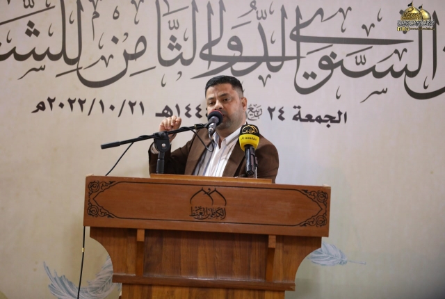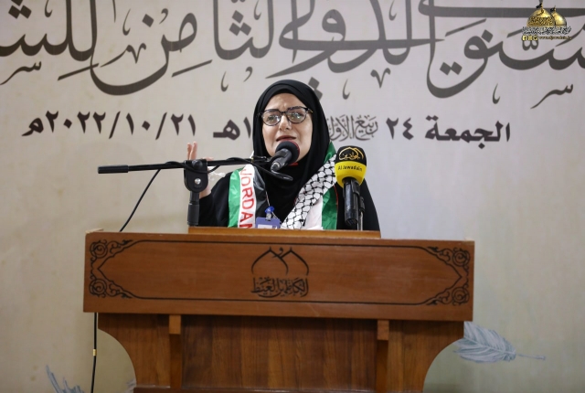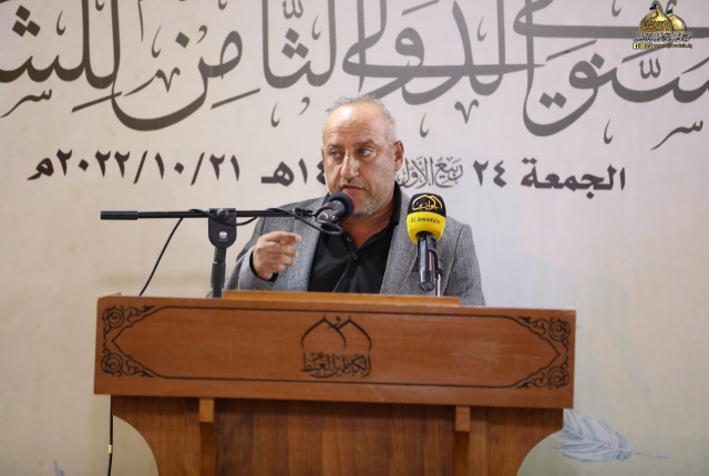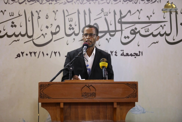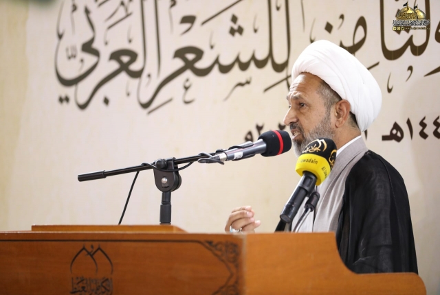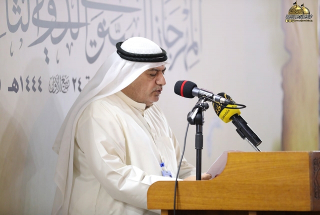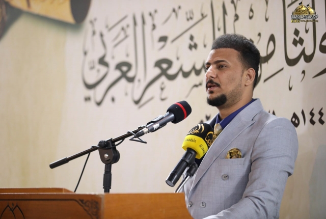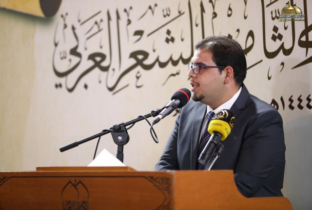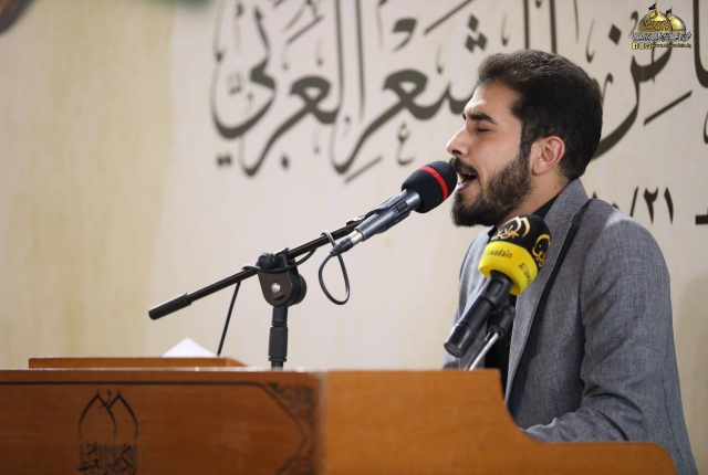 وأضاف: تسلمت اللجنة المنظمة للمهرجان تسعا وثلاثين قصيدة من داخل العراق وخارجه ترنمت قوافيها بفخر الكائنات وسجدت كلماتها في محراب العشق المحمدي مرتدية حلة الولاء والمودة لمن هو على خلق عظيم، فتم قبول ثلاث وعشرين قصيدة بعد عرض جميع المشاركات على لجنة ذات خبرة للفحص والتقويم وها نحن اليوم وإياكم في هذه الرحاب الطاهرة نترجل من صهوة المؤتمر العلمي الدولي السنوي الحادي عشر الذي انعقد في الجمعة الماضية لنركب سفينة الشعراء وسط أمواج بحور الشعر العربي ولنغوص في أعماقها ونجني من قاعها دررا تتلألأ في سماء الشعر والشعراء من جوار جنة الفردوس جنة موسى والجواد عليهما السلام).