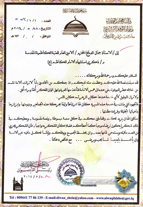 سجلت الأمانة العامة للعتبة الكاظمية المقدسة المتمثلة بأمينها العام أ . د "جمال الدباغ" وأعضاء مجلس إدارتها الموقر أروع صور الخدمة والولاء في الزيارة المليونية لذكرى استشهاد الإمام موسى بن جعفر الكاظم" عليه السلام" وتجسدت من خلال إشرافها المباشر على عمل اللجان التي نظمتها أثناء الزيارة المباركة والمكلفة بتهيئة مستلزماتها كافة، فضلاً عن تنسيقها مع الجهات الرسمية والدوائر الحكومية ومؤسسات المجتمع المدني لتقديم أفضل الخدمات للحشود المليونية الوافدة لإحياء شعائر هذه المناسبة وما كان هذا النجاح ليتحقق لولا تضافر جهود جميع خَدَمَة العتبة المقدسة وعملهم كأسرة واحدة، ولأجل ذلك تقدم معالي رئيس ديوان الوقف الشيعي سماحة السيد "صالح الحيدري" بالشكر والتقدير إلى الأمين العام للعتبة الكاظمية المقدسة أ.د "جمال الدباغ" مشيداً بالجهود المتضافرة في إنجاح الزيارة المليونية، سائلاً الله العلي القدير أن يوفقه وجميع الخدم العاملين لكل ما فيه خير للأمة وأن يأخذ بأيديهم لما يحب ويرضى.
