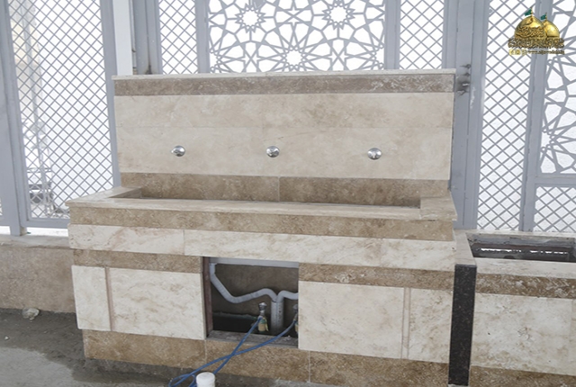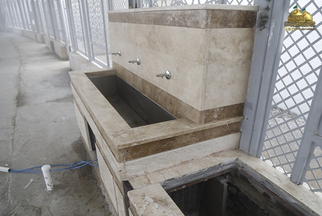 وتم الانتهاء من أعمال تسقيف جانبي الصحن والتي شملت نصب القواعد والأعمدة والجسور للهيكل الحديدي للمسقف مع تثبيت ألواح (K-SPAN)، وبذلك ستكون المساحة المسقفة حوالي (6,400 م2) وبنسبة إنجاز (100%).