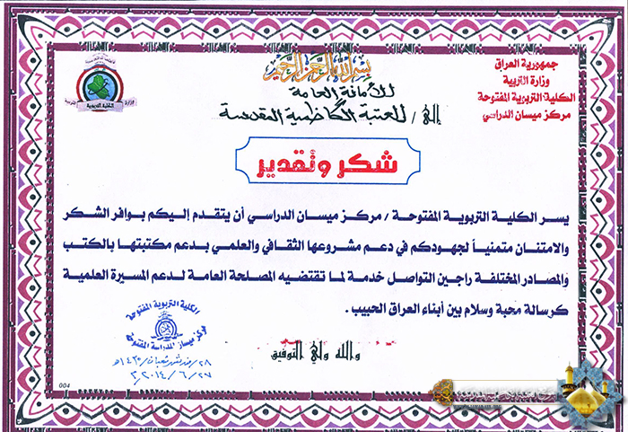 توجهت الكلية التربوية المفتوحة / مركز ميسان الدراسي ببالغ شكرها وتقديرها إلى الأمانة العامة للعتبة الكاظمية وذلك لدعمها للمشروع الثقافي في تلك المؤسسة من خلال رفد مكتبتها بالكتب والمؤلفات والمصادر المختلفة، وجاءت هذه الخطوة المباركة لتؤكد الأمانة العامة على منهجها العام وستراتيجيتها في التنمية الإنسانية، وإيمانها برعاية شريحة الشباب والاهتمام بهم لتعزيز الوعي المعرفي وترسيخ المفاهيم الأخلاقية والإسلامية والتوجيهات التربوية والعقائدية لديهم .