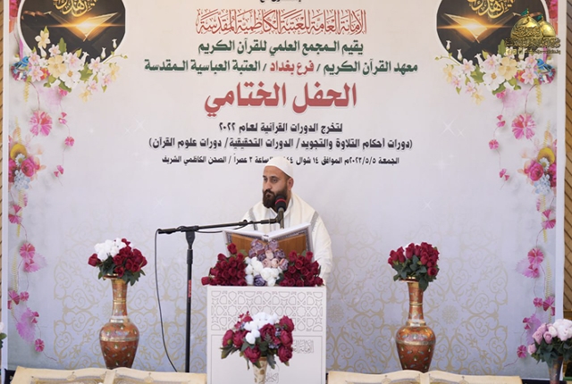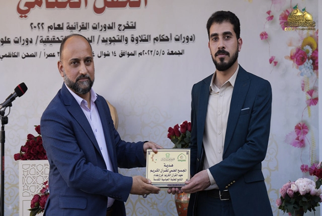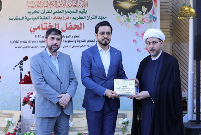 من بقعة الطهر المُفعمة بالقداسة والإيمان من رحاب الإمامين الهمامين موسى بن جعفر الكاظم ومحمد بن علي الجواد "عليهما السلام" استضافت الأمانة العامة للعتبة الكاظمية المقدسة وبالتعاون مع الأمانة العامة للعتبة العباسية المقدسة/ المَجمع العلمي للقرآن الكريم ـ معهد القرآن الكريم فرع بغداد حفل اختتام دورات أحكام التلاوة والتجويد، والدورات التحقيقية، ودورات علوم القرآن الكريم بمشاركة (550) طالب، وبحضور نخبة من ممثلي المؤسسات والروابط القرآنية والمهتمين بالشأن القرآني.