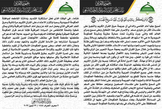 ختاما.. في الوقت الذي نعلن استنكارنا الشديد وإدانتنا القاطعه لموافقة الحكومة السويدية رسميا بتكرار الاعتداء على القرآن الكريم مرة ثانية وحرق العلم العراقي الذي يحمل اسم الله عز وجل أمام السفارة العراقية والذي يمثل خطوة واضحة للانتقاص من السيادة العراقية فإننا ندعم قرار الحكومة العراقية الموقرة بقطع العلاقات الدبلوماسية مع السويد عاجلا كما ندعو إلى مقاطعتها مقاطعة كاملة في مختلف الاتجاهات لحين تقديم الحكومة السويدية اعتذراها عن الإساءة للقرآن الكريم والتعهد بعدم تكرار ذلك وإعلان ذلك أمام العالم، وعلى جميع الحكومات الإسلامية أن تقوم بالخطوة ذاتها ثأرا للقرآن الكريم ولكرامة المسلمين وعلى الشعوب الإسلامية أن تعمل بجد على نصرة القرآن الكريم بطرق قانونية ودستورية فضلا عن استثمار الماكنة الإعلامية بكل صنوفها ومنها مواقع التواصل الاجتماعي لتعريف العالم بحقيقة القرآن الكريم ذلك الكتاب السماوي الذي يدعو إلى الفضيلة ومكارم الأخلاق وإفشاء السلام، ويؤمن بكل أنبياء الله وكتبه ورسله ولا يفرق بين أحد من رسله  بنص آيات القرآن الصريحة،  كذلك العمل على تعرية الأعداء الذين يريدون بنا شرا والذين يحاربون الله ورسوله ولا يهمهم سوى الشهرة مع حفنة من الدولارات تمنحها لهم قوى الكفر والاستكبار العالمي حتى وإن احترق العالم (لاسمح الله).