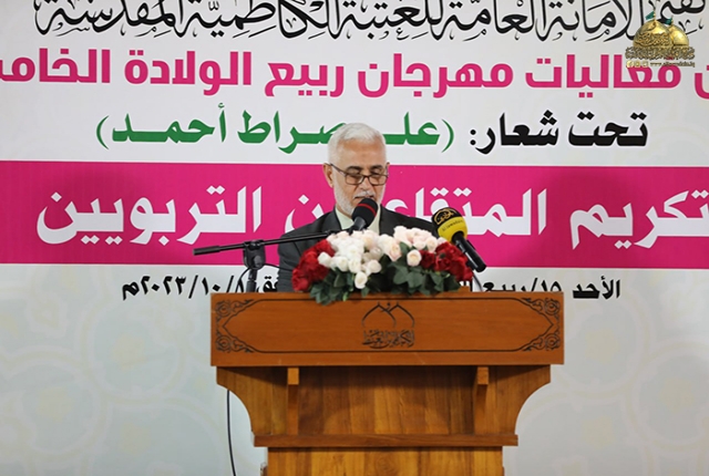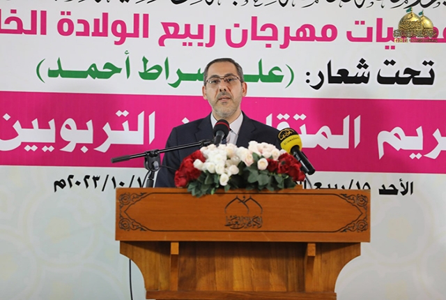 استهل الحفل بتلاوة مباركة من الذكر الحكيم شنّف بها أسماع الحاضرين قارئ العتبة المقدسة السيد عبد الكريم قاسم، بعدها كلمة الأمانة العامة للعتبة الكاظمية المقدسة وألقاها أمينها العام جاء فيها قائلاً: (أيها الأساتذة الكرام.. أيها المعلِّمون والمعلمات.. أيها المربُّون والمربِّيات.. أيها الآباء للأجيال.. ما أعظم هذا اللقاء حيث نقف -اليومَ- ونحن نحتفي بذلك المعلم الأول (صلوات الله عليه) في أيام ولادته الميمونة الكريمة على البشرية كلها، ذلك المولود العظيم الذي أخرج الله به الناس من الظلمات إلى النور، فالعلم والمعلم والمتعلم من أعظم المفردات التي أعتنى بها الإسلام في نظامه المتكامل، ولو أردنا أنْ نتتبع النصوص المباركة في ذلك لطال بنا المقام، إنَّ لقاءنا بكم في هذه الأيام المباركة إنما هو لقاء التشريف، وليس لقاء التكريم، فإنَّكم مكرَّمون من قبل الله تعالى، ومن قبل النبي والأئمة (صلوات الله عليهم)، ولكننا اليومَ نتشرَّفُ بلقائِكم، ونعترفُ بفضلِكم، ونبيَّنُ للأمة مقامَكُم، ونعرِّفُ الاجيالَ آثارَكُم، ونذكِّرُهُم أنَّ المعلم هو صاحب فضل عظيم علينا جميعًا، فلا يوجد اليوم إنسان في المجتمع لا يعترف بفضل المعلم، فالطبيب الذي يعالج الناس إنما هو من ثمار المعلم، والمهندس والمحامي والإداري وغيرهم، وكُلُّ إنسان يبني هذا المجتمع ويخدمه إنما هو من ثمار المعلم، إذًا فالمعلم هو أساس كُلِّ تلك الفضائل، وهو أساس كُلِّ تلك الإنجازات التي تراها المجتمعات.