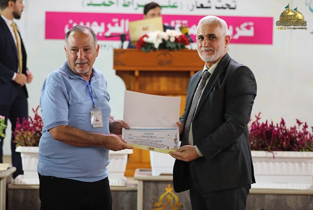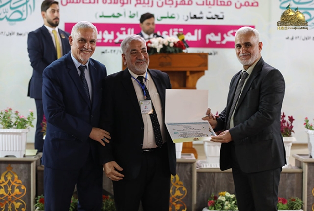 ابتهاجاً بذكرى ولادة سيد الكائنات نبينا محمد "صلّى الله عليه وآله وسلّم" وحفيده إمامنا السادس جعفر الصادق "عليه السلام"، وضمن فعاليات مهرجان ربيع الولادة الخامس المُقام تحت شعار: (على صراط أحمد)، وبرعاية مباركة من قبل الأمين العام للعتبة الكاظمية المقدسة خادم الإمامين الكاظمين الجوادين الدكتور حيدر حسن الشمّري، أقامت الأمانة العامة للعتبة الكاظمية المقدسة حفل تكريم نخبة من الأساتذة التربويين المتقاعدين في مديريات تربية بغداد الكرخ والرصافة وذلك تقديراً لجهود تلك القامات الإنسانية وعرفاناً لمسيرتهم العلمية والمهنية لما قدموه من الجهد والعطاء طيلة سنوات عملهم، بحضور عدد من المديرين العمومين، وكوكبة من الملاكات التربوية والتعليمية والإدارية.