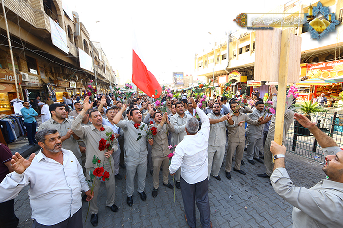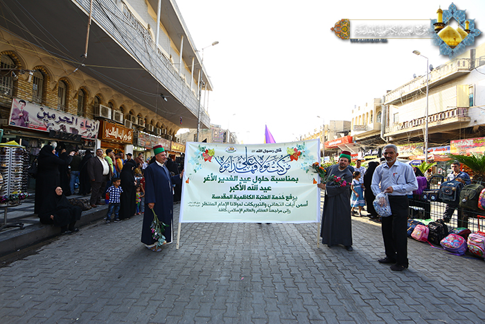 تجديداً للعهد والولاء لسيد البلغاء والمتكلمين أسد الله الغالب الإمام علي بن أبي طالب"عليه السلام" نظم موكب خَدَمَة العتبة الكاظمية المقدسة مسيرة ولائية انطلقت من حسينية آل الصدر متجهة نحو المشهد الكاظمي وصولاً إلى مرقد الإمامين الهمامين الكاظمين "عليهما السلام"، صدحت بها حناجر المشاركين بالهتافات التي عبرت عن الولاء المطلق للإمام علي بن أبي طالب "عليه السلام"، و تحفهم رايات العهد الولاء حاملين الشموع ابتهاجاً بعيد الولاية الكبرى والإمامة العظمى.