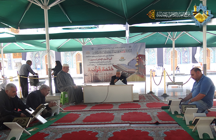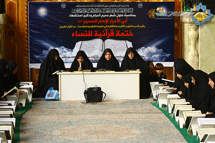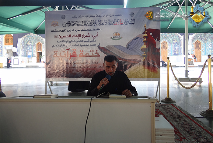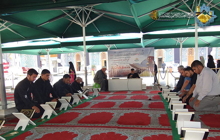 بمناسبة حلول شهر محرم الحرام وذكرى استشهاد الإمام الحسين "عليه السلام"، وانطلاقاً عما ورد في الزيارة الجامعة " كنت للرّسول صلّى الله عليه وآله ولدا، وللقرآن سندا، وللإمّة عضدا" وتأكيداً للعلاقة الوطيدة بين العترة الطاهرة والقرآن الكريم في قول النبي الأكرم محمد "صلى الله عليه وآله" ( إني تارك فيكم الثقلين : كتاب الله ، وعترتي أهل بيتي ، ما إن تمسكتم بهما لن تضلوا بعدي أبدا )، أقام قسم الشؤون الفكرية والثقافية في العتبة الكاظمية المقدسة/ دار القرآن الكريم الختمة القرآنية المهداة للإمام الحسين وشهداء الطف "عليهم السلام"، للرجال والنساء في أروقة الصحن الكاظمي الشريف، وبواقع جزء واحد في كلّ يوم ولمدة شهر، مهداة للإمام الحسين وشهداء الطف "عليهم السلام" بمشاركة قراء العتبة الكاظمية المقدسة وبحضور الجموع الغفيرة من زائري الإمامين الجوادين "عليهما السلام".