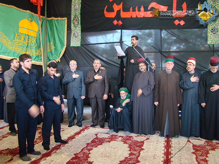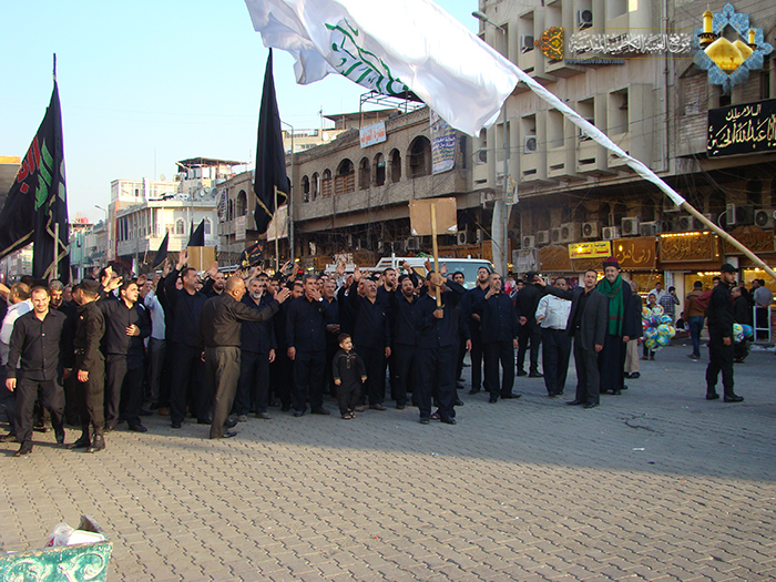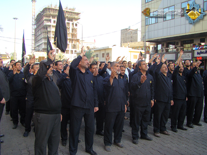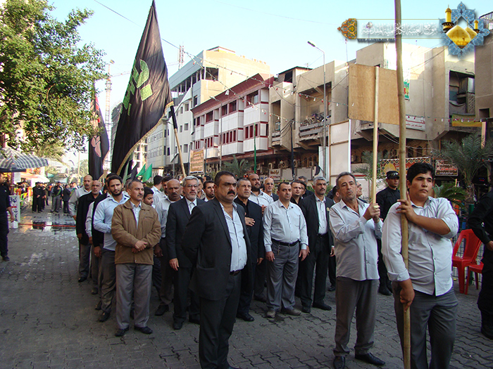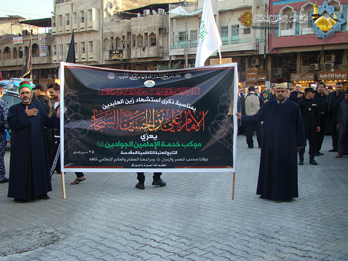 أحيا خَدَمَة العتبة الكاظمية المقدسة الذكرى الأليمة لاستشهاد سيد العابدين وسلالة الوصيين الإمام علي بن الحسين "عليه السلام" عصر الأربعاء 19/11/2014م بحضور الأمين العام للعتبة الكاظمية وعدد من أعضاء مجلس الإدارة، حيث تجمهر المعزون عند حسينية آل الصدر في شارع باب المراد وانطلقوا بمسيرة ولائية حاشدة معلنين فيها عن حزنهم بهذا المصاب الجلل، مرددين خلالها الهتافات والردات ومستذكرين فيها فاجعة استشهاده ومظلوميته "عليه السلام"، واختتمت بمجلس للعزاء الحسيني مواساةً فيه حفيديه الإمامين الجوادين "عليهما السلام" بهذه المصيبة الراتبة، وفي ختامها ابتهل المعزون إلى الباري عز وجل أن يحفظ العراق وشعبه من كل سوء والنصر السديد لقوات الحشد الشعبي وهم يدافعون عن حرمة مقدساتنا .