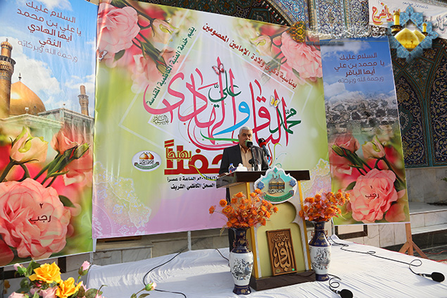 ينبغي أن نستثمر هاتين الولادتين الميمونتين في زيادة الحث على الاقتداء بنهج الأئمة المعصومين "عليهم السلام" وخطهم الرسالي والالتزام بالإيمان الحقيقي وأن يكون الجهاد في ساحات المعارك خالصاً في سبيل الله ودفاعاً عن الوطن العزيز والالتزام بتوجيهات المرجعية الرشيدة, كما ندعو الى المزيد من الجهاد في سبيل الله وبذل الغالي والنفيس تلبية لفتوى المرجعية الرشيدة , وأن ترعى عوائل الشهداء فهم أمانة في أعناقنا سائلين المولى القدير أن ينصر قوات الحشد الشعبي وقواتنا المسلحة وأن يتغمد شهداءنا بالرحمة ويسكنهم فسيح الجنات ويعجل بشفاء الجرحى.. " بعدها ارتقى المنصة الخطيب الحسيني سماحة الشيخ منير الكاظمي ليلقي في محاضرته القيّمة الضوء على شذرات من حياة الإمام الباقر ومسيرته الحافلة المعطاء متحدثاً عن هذه الشخصية التي توافرت كل المقومات والمؤهلات للزعامة والإمامة والقيادة والريادة حتى اضحى محط ثناء العلماء والفقهاء والفضلاء، مستشهداً بفضائله بلسان الدهر والعلماء الذين ملأت أسماؤهم ونتاجاتهم الآفاق. كما تناول جزءاً من حياة الإمام الهادي الذي تصدى للإمامة وهو في سن مبكر، ودوره الفاعل والذي تجسد بمدرسته الشريفة التي تخرج منها عدد كبير من العلماء والفقهاء، فضلاً عن دوره في المجادلات والمناظرات ومواجهته للمدارس الكلامية المنحرفة، والدفاع عن حقوق أهل بيت النبوة "عليهم السلام"، وتطرق إلى الإرث الفكري والحضاري الزاخر الذي تركه "عليه السلام" لأمة جده رسول الله "صلى الله عليه وآله" والتي لها أثر بالغ في نفوس المسلمين لما تحمله من قيمٍ ومعانٍ سامية. وشهد الحفل مشاركة لشاعر أهل البيت السيد نبيل أبو العيس بمجموعة قصائد رائعة ومنها هذه الأبيات: بحق الإمام الباقر "عليه السلام":