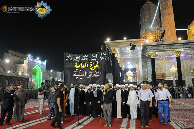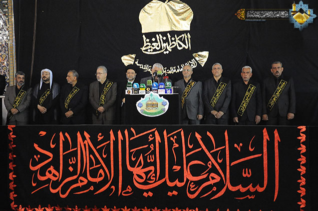 لوحة جديدة رسمتها رحاب الإمامين موسى والجواد "عليهما السلام" وهي تؤمّ القلوب الموالية المؤمنة لتجسد في طياتها مشاهد الحزن والآلم والأسى لفقد الإمام المسموم المظلوم والمعذب في قعر السجون الإمام موسى بن جعفر الكاظم "عليه السلام"، لتعود بهم الذكرى إلى شذرات حياته الشريفة ومناقبه وصبره وكبريائه وتقواه، إذ شهدت رحاب الصحن الكاظمي الشريف ليلة الأحد 22 رجب الأصب 1436هـ، والموافق 10 أيار 2015مراسم استبدال رايتي قبتي الإمامين الجوادين "عليهما السلام" برايات الحزن السوداء في مراسم مهيبة جرت وسط حضور وكيل المرجع الديني الأعلى سماحة آية الله العظمى السيد علي الحسيني السيستاني "دام ظله الوارف" في مدينة الكاظمية المقدسة سماحة الشيخ حسين آل ياسين ومعالي رئيس ديوان الوقف الشيعي سماحة السيد علاء الموسوي والأمين العام للعتبة الكاظمية المقدسة أ. د جمال عبد الرسول الدباغ، والسادة أعضاء مجلس الإدارة ورؤساء الأقسام والشعب ، وممثلي العتبات المقدسة، وعدد من الشخصيات الدينية والسياسية والاجتماعية وجمع غفير من وجهاء وشيوخ مدينة الكاظمية المقدسة ومسؤولي دوائرها الأمنية والخدمية وزائري الإمامين الجوادين "عليهما السلام". استهلت المراسم بتلاوة مباركة من الذكر الحكيم شنف بها قارئ العتبة السيد عبد الكريم قاسم أسماع الحاضرين، تلتها مشاركة لموكب السادة والمشايخ الفضلاء في الحوزة العلمية الشريفة ومواكب مدينة الكاظمية المقدسة وهي تعلن حدادها لذلك المصاب الجلل الذي فجر المآقي وأفجع القلوب، بعدها كلمة الأمانة العامة للعتبة الكاظمية المقدسة ألقاها أمينها العام أ . د جمال الدباغ وبيّن فيها قائلاً: " إننا إذ نحيي ذكرى إستشهاد مولانا كاظم الغيظ "عليه السلام" يستوجب منا ذلك أن نستلهم منه كل معاني الخير والصلاح, ونتأمل فيه لغة المحبة والتسامح وحب الخير للجميع , فمن الواجب أن تشيع بيننا جميعاً لغة المحبة والتسامح ونجعل من سيرة العبد الصالح مفتاحاً للتوغل إلى قلوب الآخرين , كما يجب أن نتعلم منه معنى الصمود والإرادة والتصدي للظلم والعدوان, خصوصاً ونحن نعيش مرحلة الصراع والتحدي مع الأعداء فينبغي أن نجعل من هذه الزيارة المليونية والمسيرة الجماهيرية الزاحفة إلى مرقدي الإمامين الجوادين "عليه السلام" عنواناً للتحدي والإصرار على مواجهة أعداء الله والوطن والمقدسات . وأضاف قائلاً: لقد تظافرت جهود كثيرة من أجل خدمة الزائرين القاديمين حيث اشترك ديوان الوقف الشيعي والعتبات المقدسة والمؤسسات الحكومية ومنظمات المجتمع المدني والمواكب الحسينية والأهالي، وهناك من هذه السنة مشروع التبليغ الديني الذي تقوم به العتبات المقدسة مجتمعة بإشراف المرجعية الدينية العليا المتمثلة بسماحة آية الله العظمى السيد علي الحسيني السيستاني "دام ظله الوارف" وسيغطي المشروع مدينة الكاظمية المقدسة وأنحاء بغداد.