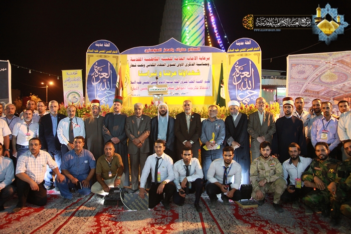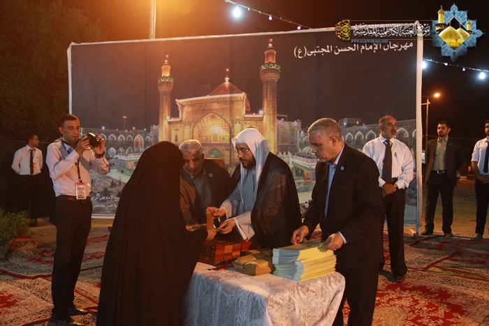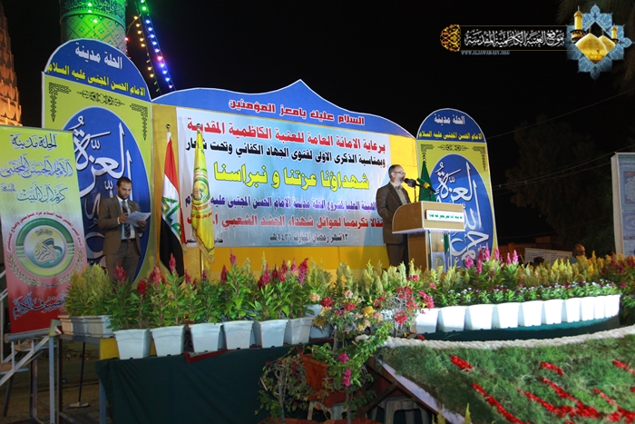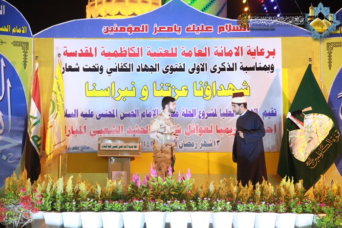أقامت الأمانة العامة للعتبة الكاظمية المقدسة احتفالاً تكريمياً لعوائل شهداء الحشد الشعبي بالتعاون مع الهيئة العليا لمشروع الحلة مدينة الإمام الحسن المجتبى "عليه السلام"، في الثالث عشر من شهر رمضان المبارك 1436هـ الموافق 1/7/2015م ، والمُقام في مزار ردّ الشمس بمحافظة بابل تحت شعار: (شهداؤنا عزتنا ونبراسنا)، والمتزامن مع ذكرى الولادة الميمونة لحفيد رسول الله "صلى الله عليه وآله" ثاني أئمة الهدى الإمام الحسن المجتبى "عليه السلام"، والذكرى السنوية الأولى لإعلان فتوى الجهاد الكفائي التي أطلقها سماحة المرجع الديني الأعلى آية الله العظمى السيد علي الحسيني السيستاني "دام ظله الوارف " للدفاع عن العراق والمقدسات. وتضمنت فعاليات الحفل تلاوة آيات بينات من كتاب الله العزيز شنف بها قارئ العتبة السيد عبد الكريم قاسم أسماع الحاضرين، ومراسم لرفع راية الإمامين الجوادين "عليهما السلام" وقراءة إنشودة الفردوس ثم تلتها محاضرة دينية لسماحة الشيخ عماد الكاظمي عضو مجلس إدارة العتبة المقدسة، تطرق فيها إلى جوانب مهمة في حياة الإمام الحسن "عليه السلام"، فضلاً عن أهمية الزيارة والتشرف بالتواصل واللقاء مع عوائل الشهداء الحشد الشعبي، حيث أعد سماحته هذا الأمر هو تقرباً إلى الله تعالى، لأن هؤلاء الثلة المؤمنة قدمت أعز ما تملك وهم فلذات أكبادهم، بل وضحوا بالغالي والنفيس تلبية لنداء المرجعية الرشيدة والحفاظ على تراب الوطن والمقدسات من دنس الأعداء التكفيريين ومن لف لفهم. كما كانت هناك مشاركة لشاعر العتبة الكاظمية المقدسة الأستاذ رياض عبد الغني الكاظمي حيث القى خلالها قصيدة شعرية رائعة أفاضت بذكر فضائل ومحاسن صاحب الذكرى الإمام الحسن "عليه السلام" وأبيات أخرى مجدت انتصارات الحشد الشعبي وهو يخوض أروع الملاحم البطولية في معارك تحرير أرض العراق المغتصبة من قبل قوى الإرهاب التكفيري. وتخلل المهرجان عرض مسرحي بعنوان " لقاء الأبرار " والذي قام بتجسيد أدواره نخبة طيبة من خَدَمَة الإمامين الجوادين "عليهما السلام"، فضلاً عن مشاركة فرقة إنشاد الجوادين بالموشحات الإسلامية.