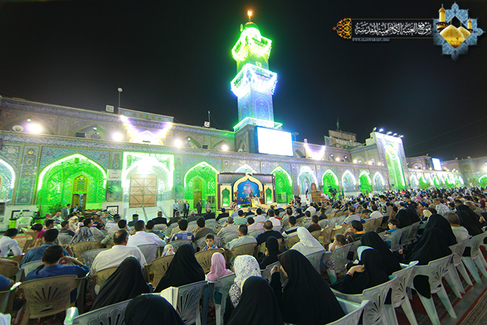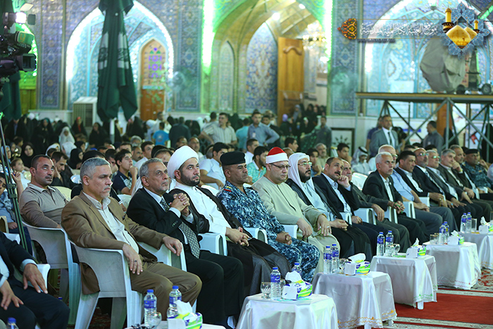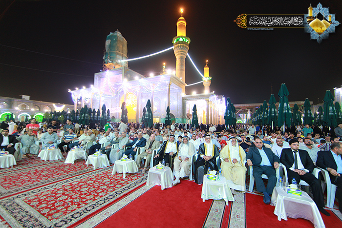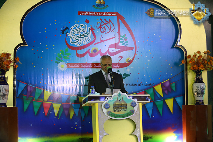 وأضاف قائلاً :"وحري بنا ونحن نعيش هذه الأيام المباركة أن نسعى جاهدين إلى توحيد الجهود، والوقوف صفاً واحداً مع مرجعيتنا الحكيمة وتلبية ندائها ومساندة أخواننا المجاهدين في الحشد الشعبي، لأن تلك الفتوى هي التي أعادت الثقة في نفوس أبناء العراق، وسنكون إن شاء الله تعالى من المحتفين والمحتفلين عندما تحرر أرضنا ونسحق الإرهاب، وترفع راية الحق خفاقة في سماء بلدنا العزيز" بعدها تألق الشاعر الأستاذ "رياض عبد الغني الكاظمي" بقصيدة رائعة عنوانها " التاريخ يتجدد" تناول فيها محطات من الولادة الكريمة ومنها هذه الأبيات: