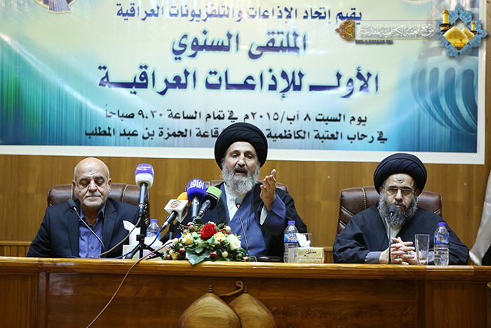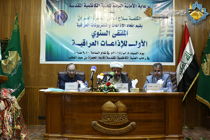 برعاية كريمة من الأمانة العامة للعتبة الكاظمية المقدسة في دعمها للحركة الإعلامية في العراق، ومد جسور التواصل والتعاون مع المؤسسات الإعلامية، وإيمانها بمسؤولية النهوض والارتقاء بمستوى الخطاب الإعلامي الهادف، أقام اتحاد الإذاعات والتلفزيونات العراقية، يوم السبت 8 آب 2015م على قاعة أسد الله الحمزة بن عبد المطلب في رحاب الصحن الكاظمي الشريف الملتقى السنوي الأول للإذاعات العراقية تحت شعار : " الكلمةُ سلاحٌ ماضٍ لنصرةِ العراق "، بحضور الأمين العام للعتبة الكاظمية المقدسة أ. د جمال عبد الرسول الدباغ والسيد رئيس اتحاد الإذاعات والتلفزيونات العراقية سماحة السيد حميد الحسيني وعدد من الأساتذة والأكاديميين المتخصصين بالشأن الإعلامي ومسؤولي وممثلي المؤسسات الإعلامية. استهل حفل الافتتاح بتلاوة مباركة من الذكر الحكيم شنّف بها قارئ العتبة المقدسة السيد عبد الكريم قاسم أسماع الحاضرين، بعدها ألقى الأمين العام للعتبة الكاظمية المقدسة أ.د جمال الدباغ كلمة بهذه المناسبة قائلاً: " إنّ التعاون بين العتبة الكاظمية المقدسة واتحاد الإذاعات العراقية ليس الأول من نوعه، فلقد سبقه نشاطات أخرى مثمرة، غير أن لقاءنا اليوم وفي رياض الإمامين الجوادين "عليهما السلام" هو الملتقى الأول من نوعه بما يضمه من حضور لمديري الإذاعات العراقية وبما يتصدى له الملتقى من محاور مهمة جادة تتحَدَّدُ من خلالها خارطة الطريق السوي للأداء الإعلامي الناهض للإذاعات العراقية يتم عبره مراعاة المشتركات الوطنية".