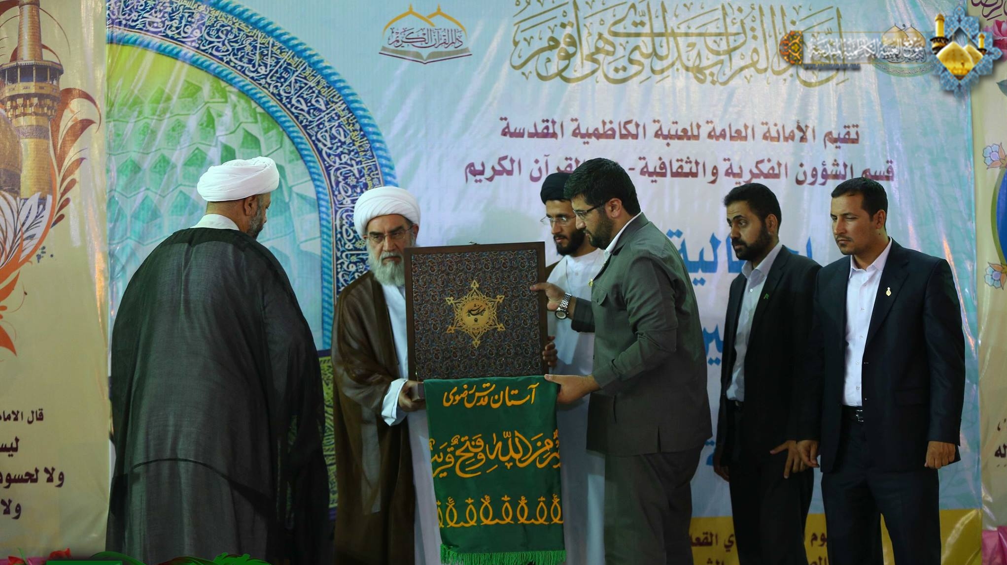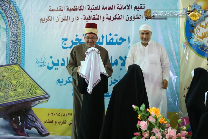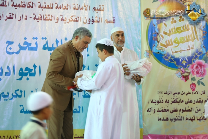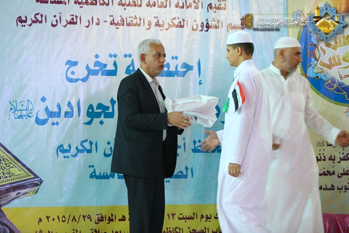 نهج واضح وخطوات مباركة للأمانة العامة للعتبة الكاظمية المقدسة, في دعمها ورعايتها للمسيرة القرآنية المباركة، وسعيها إلى تنمية الوعي القرآني لدى أفراد مجتمعنا للنهوض به إلى أرفع المستويات، وتنشئته نشأة إسلامية صحيحة تنسجم مع تعاليم ديننا الحنيف وأخلاق النبي الأكرم محمد "صلى الله عليه وآله" وأهل بيته الأطهار "عليهم السلام", وتزامناً مع الأفراح التي تعيشها الأمة الإسلامية بذكرى ولادة ثامن أئمة الهدى الإمام علي بن موسى الرضا "عليه السلام", نظّم قسم الشؤون الفكرية والثقافية في العتبة الكاظمية المقدسة / دار القرآن الكريم حفل تخرج دورة الإمامين الجوادين "عليهما السلام" الصيفية لحفظ أجزاء من القرآن الكريم، مساء السبت 13 ذو القعدة الموافق30/ آب 2015 بحضور أعضاء مجلس الإدارة وعدد من خَدَمَة العتبة الكاظمية المقدسة، والأساتذة المشرفين على الدورة، والطلبة المشاركون فيها والبالغ عددهم 180 طالباً من الذكور والإناث.