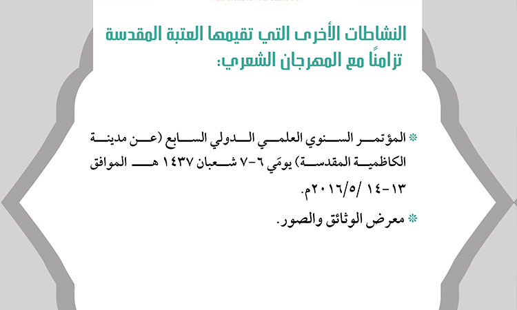 تواصل الأمانة العامة للعتبة الكاظمية المقدسة مشروعها الثقافي ومشوارها في دعم الحركة الأدبية والفكرية، إيماناً منها بضرورة الاهتمام بالإبداع والمبدعين والأدباء والشعراء والمثقفين، حيث أعلنت اللجنة التحضيرية للمؤتمر العلمي الدولي السابع إقامة المهرجان السنوي الخامس للشعر العربي تحت شعار: (تُستلهم القوافي ويسمو الشعر بولادات الشموس الشعبانية) للمدة من 6ـ 7 شعبان 1437هـ الموافق 13 ـ 14 آيار 2016م، وبينّت اللجنة التحضيرية أن القصائد تُسَلّم في موعد أقصاه 15 نيسان 2016 إلى البريد الإلكتروني: 5thpoetry@gmail .com